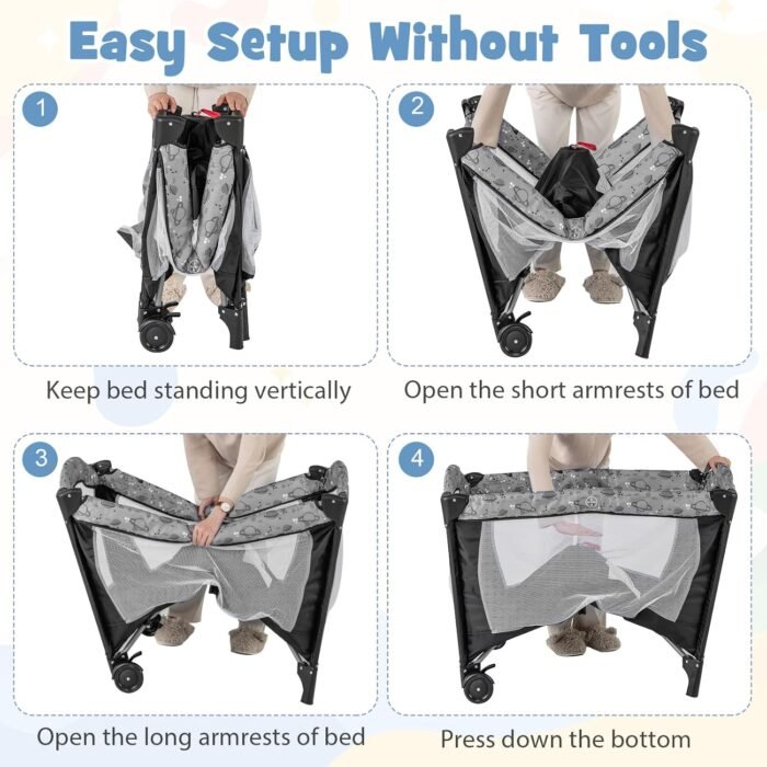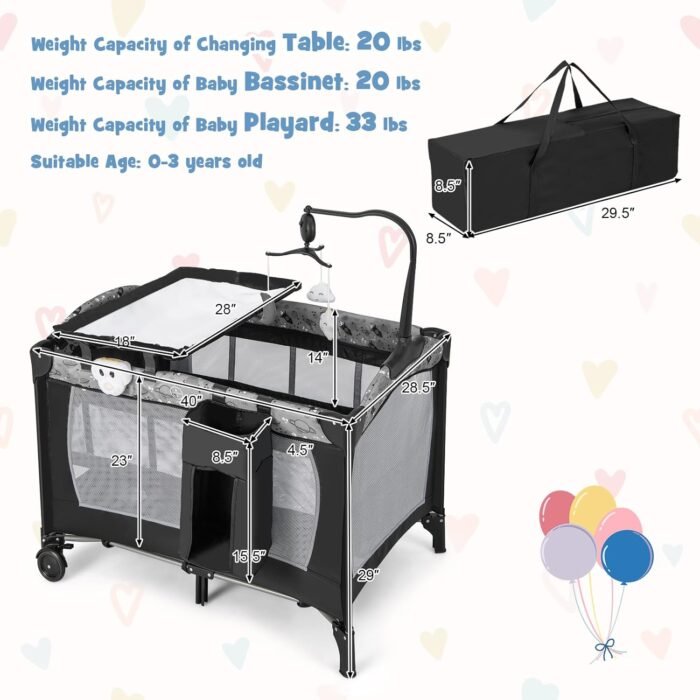【Stable All Steel Construction】: Constructed of steel pipes that support the mattress, this pack and play is stable and durable enough for babies to play for longer. Used as infant bassinet and diaper changing table for toddlers up to 22 lbs, baby playard for toddlers up to 33 lbs.