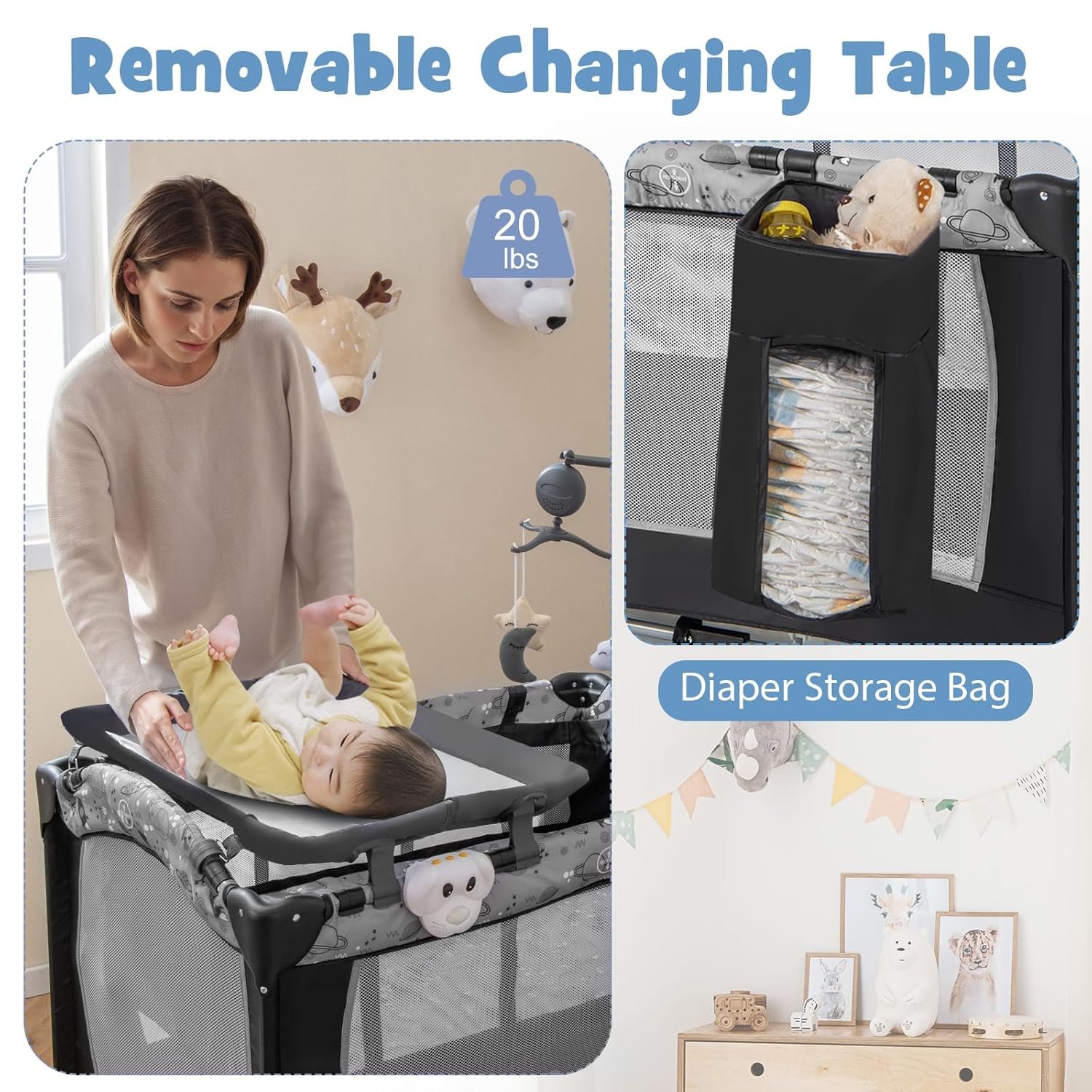 【Diaper Storage Bag & Entertainment Toy Rack】: The side diaper storage bag is convenient for mommy to put diapers and baby care supplies in hand. And newborn diapers and diaper changer come with 3 toys and music box that not only helps your baby practice grip, but also promotes touch and coordination.