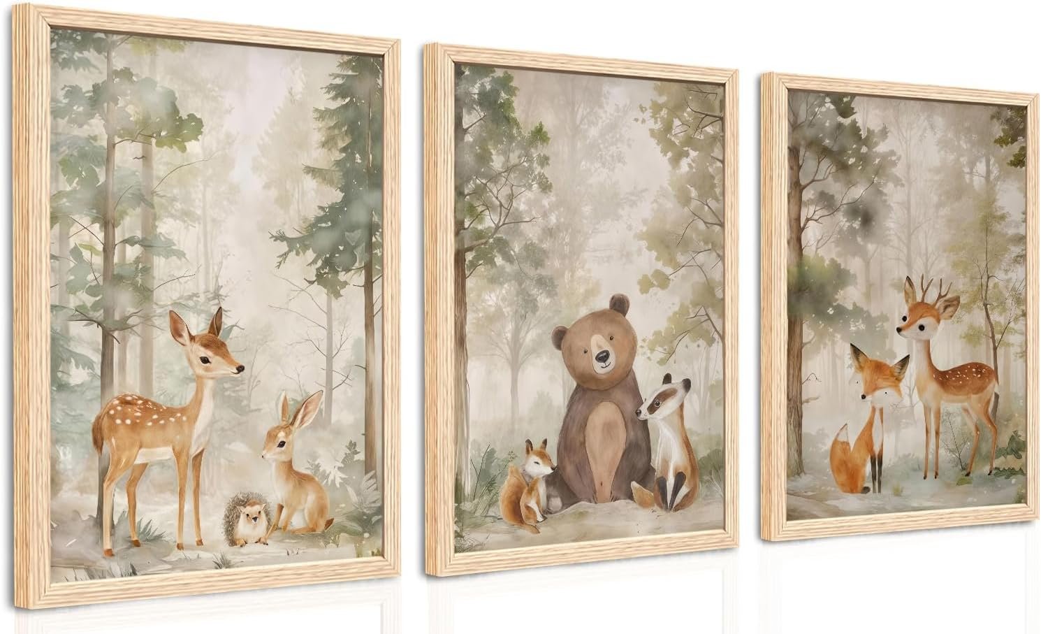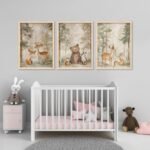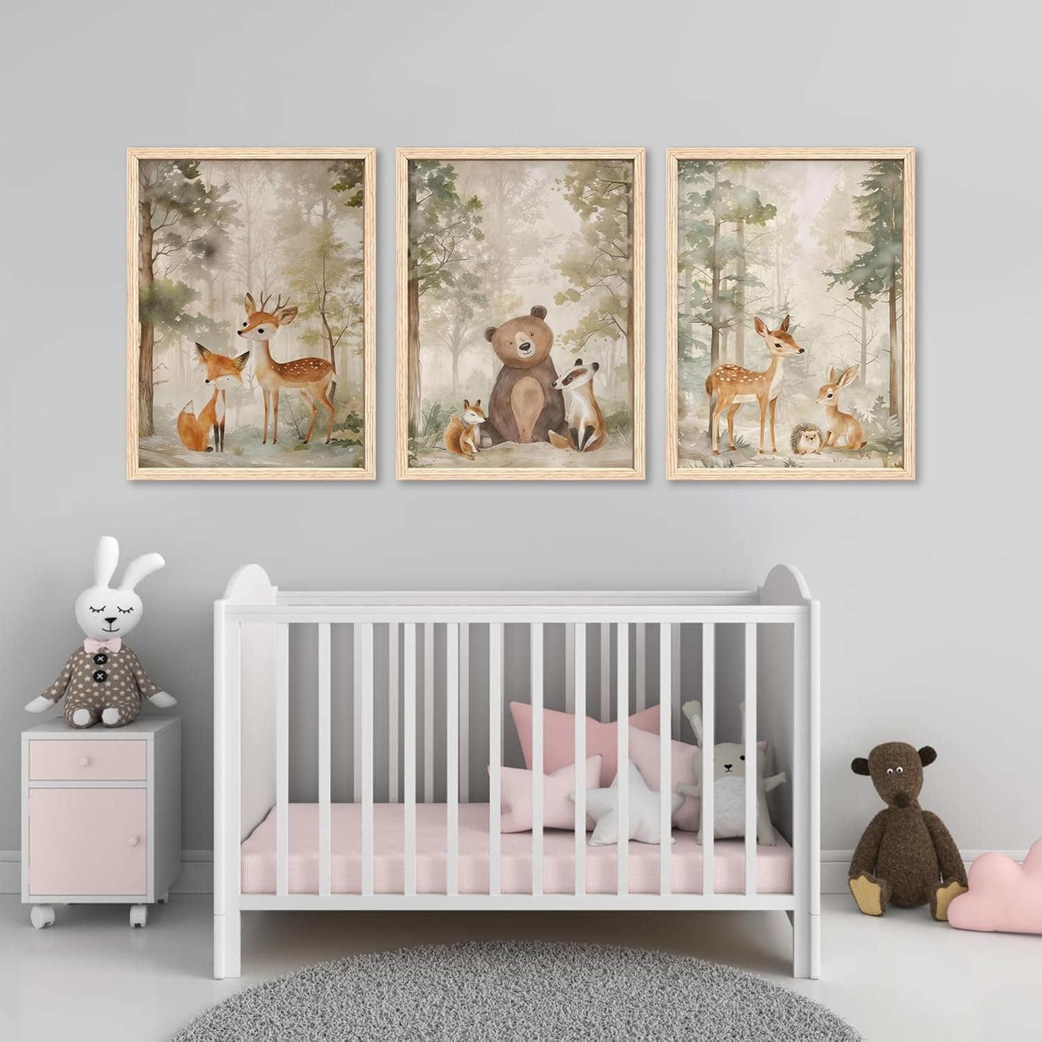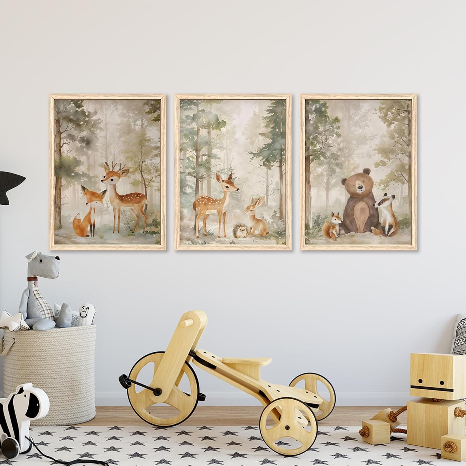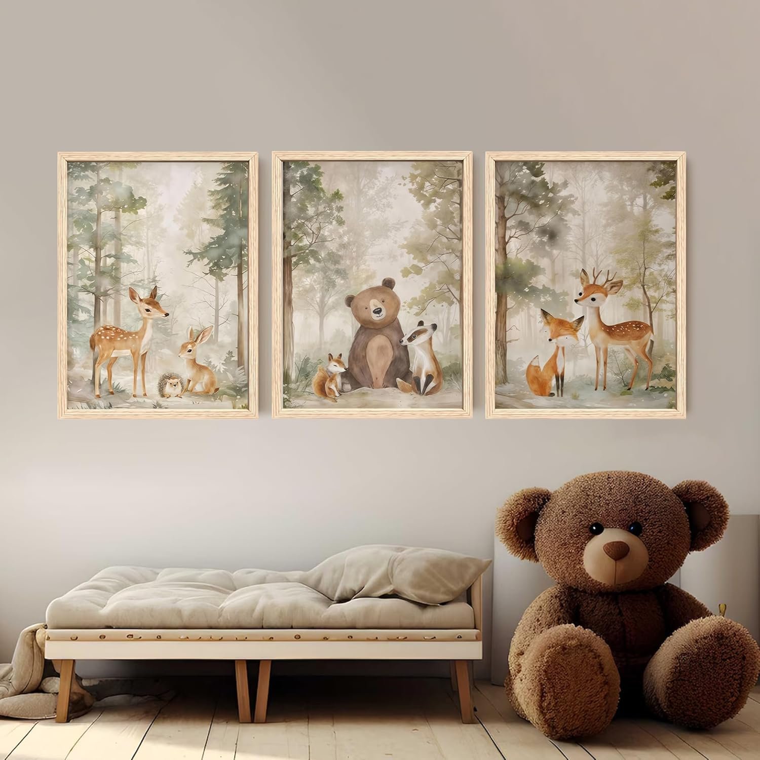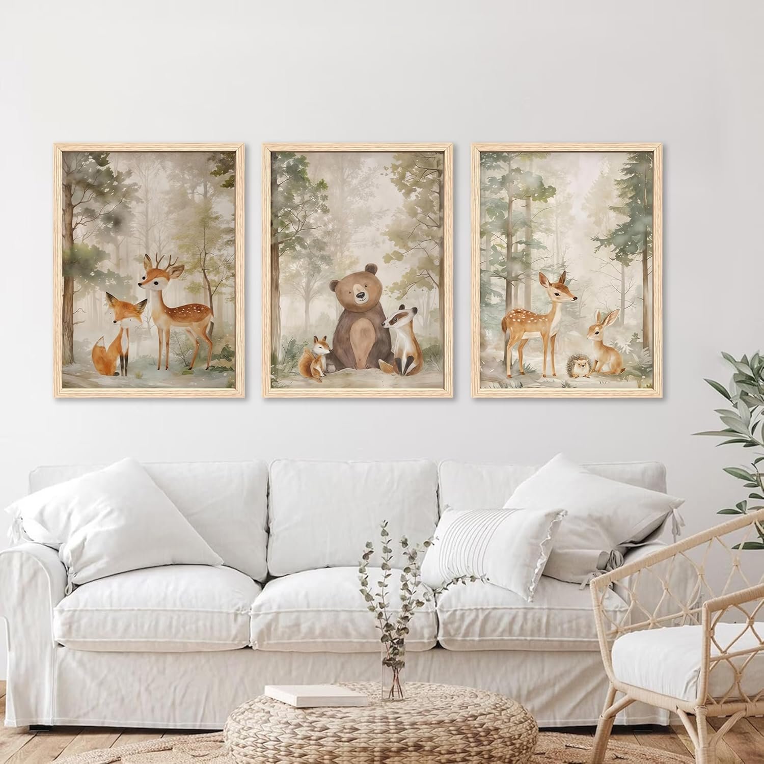 Enchanting Woodland Friends Gathering: Create a heartwarming scene with this triptych featuring adorable animal groups; gentle watercolor portraits showcase forest friends like a bear, fox, deer, rabbit, hedgehog, badger and squirrel sharing peaceful moments, embodying a charming woodland animals theme perfect for nursery art or nature wall art spaces