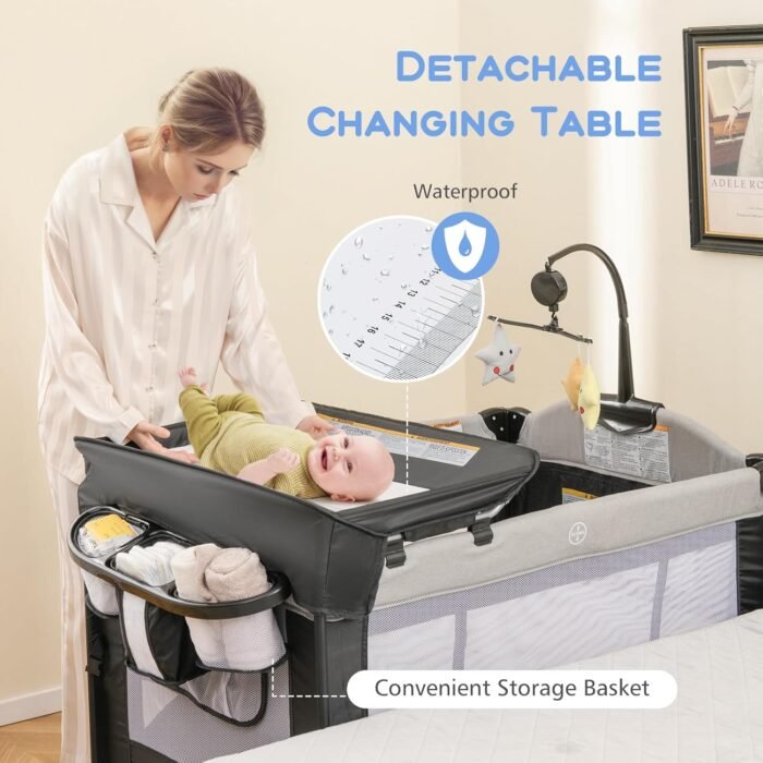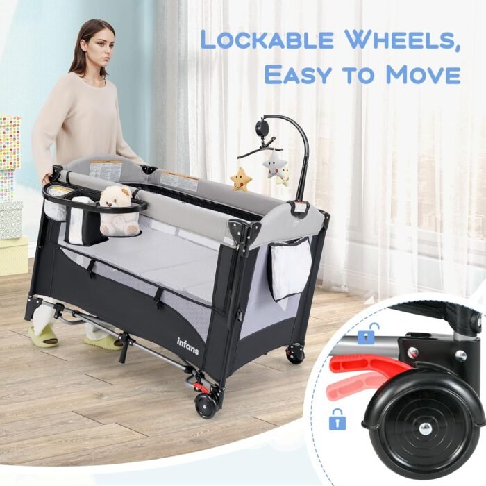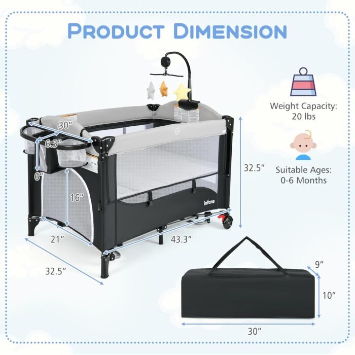 5-IN-1 PACK AND PLAY: INFANS 5 in 1 pack and play can be converted into a variety of modes to meet the different needs of the baby in the growing process: baby bedside sleeper, diaper changing table, baby rock cradle, activity center, and baby crib