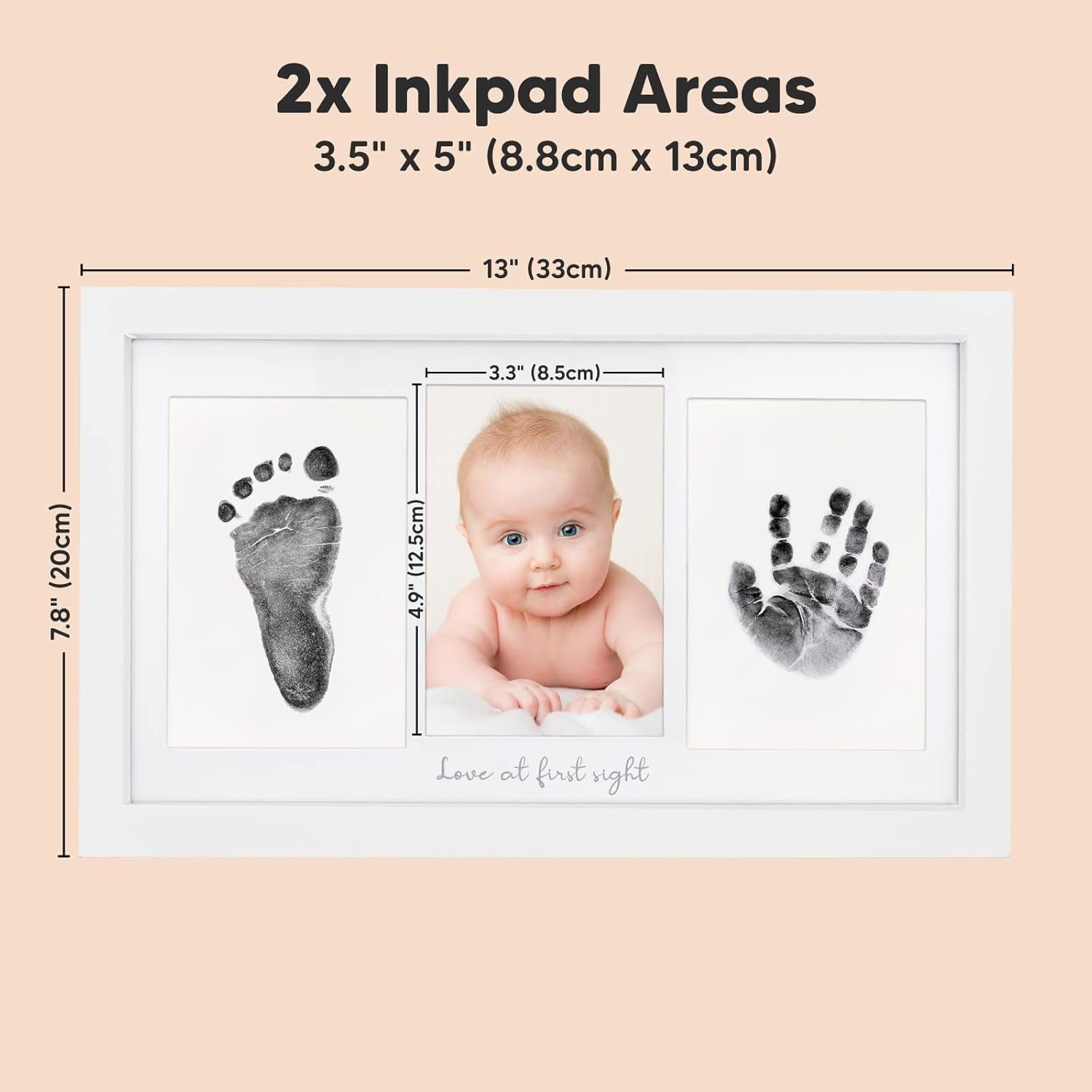No Mess, No Residue – Designed to create your baby’s hands and footprints without leaving ink residue on your baby. Our clean touch ink pads use a “zero ink contact” imprinting method to allow beautiful stamping on our baby keepsake frame.