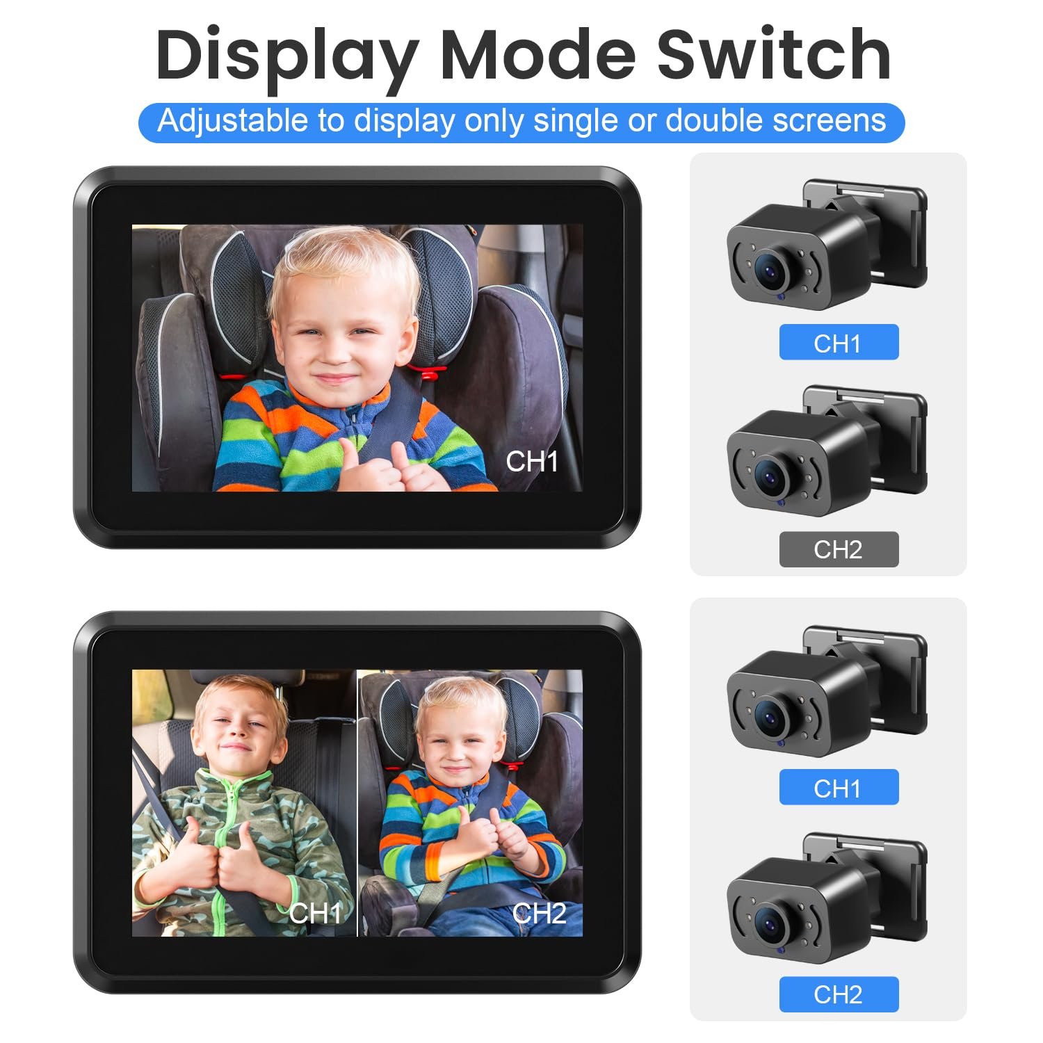 FOR PARENTS WITH 2 KIDS:Dual baby car camera suitable for parents with two babies and can display 2 camera at the same time. Upgraded 940nm IR AHD camera focuses on Ultra HD images, perfect for day and night use.