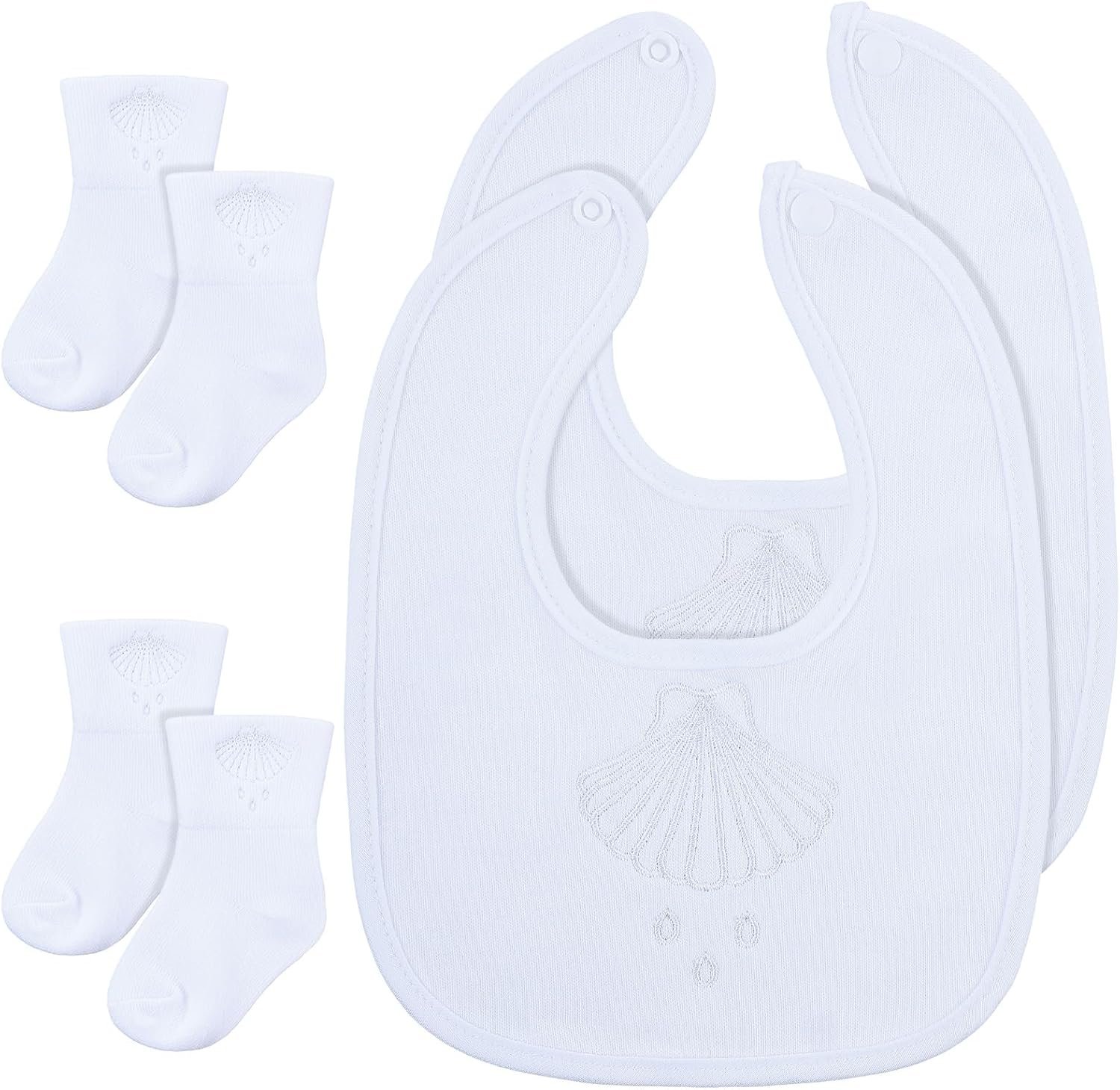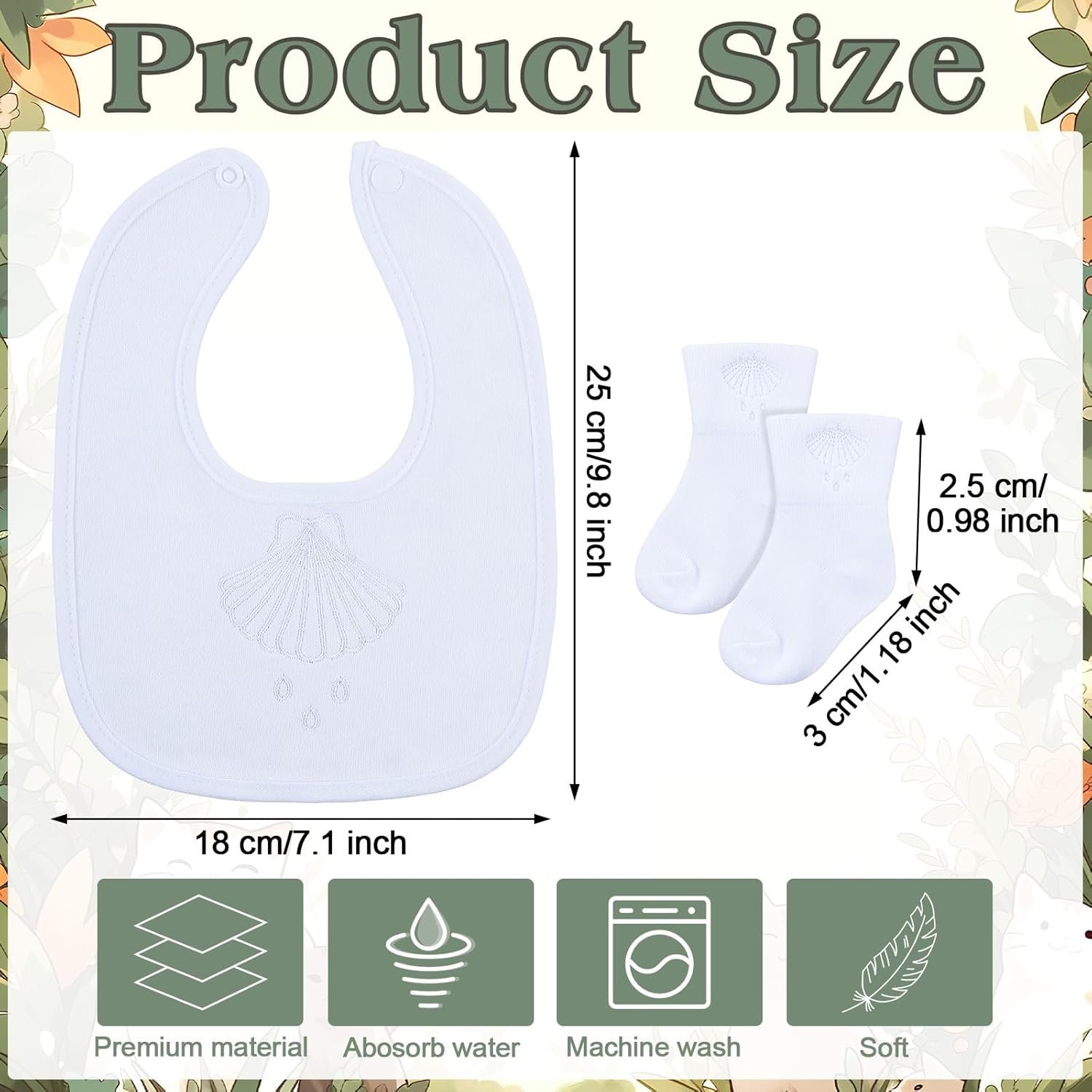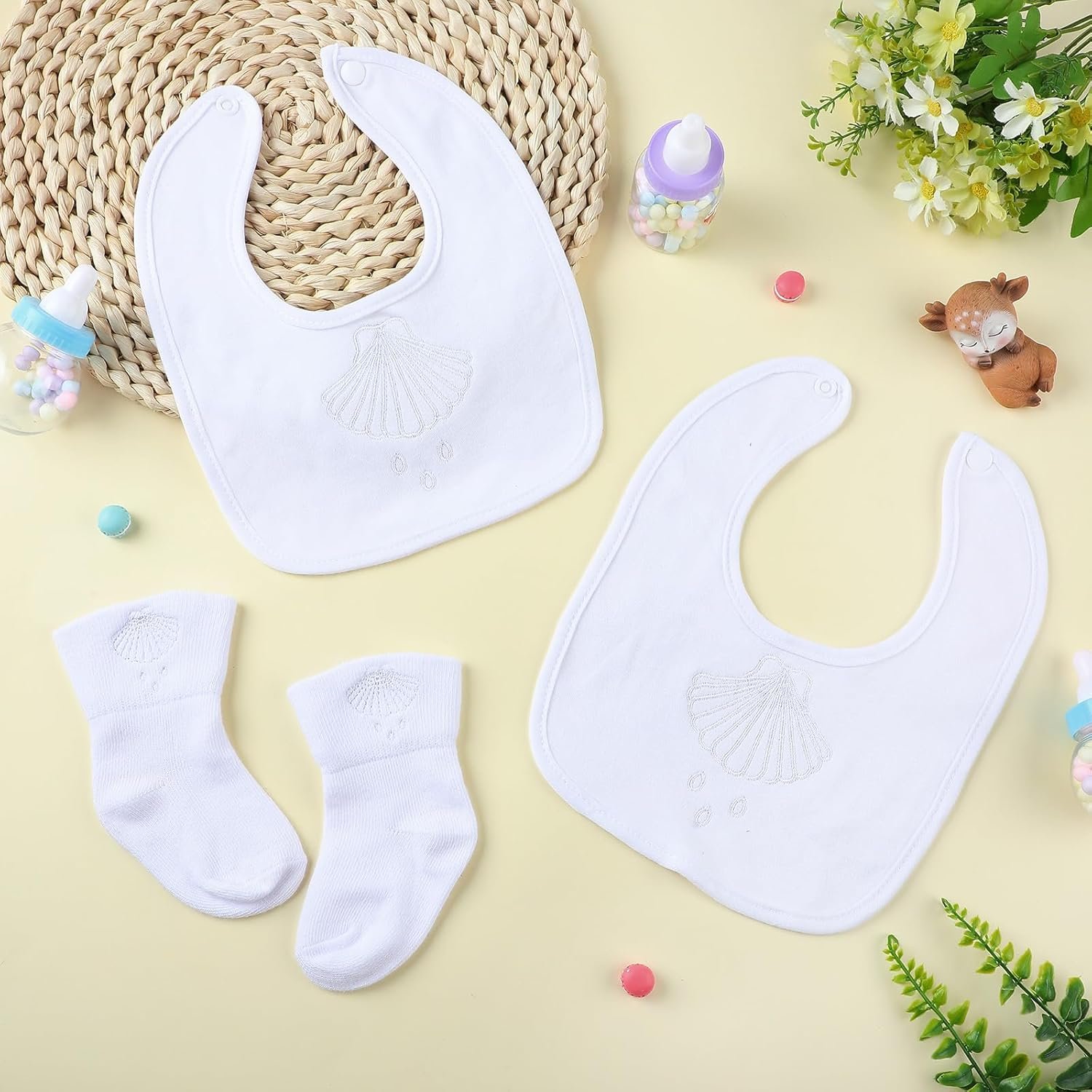 With our white embroidered shell baptism bib and socks, we bring you the ultimate baptism attire. It elevates the charm of your little one while enhancing their overall appearance during the sacred ceremony.