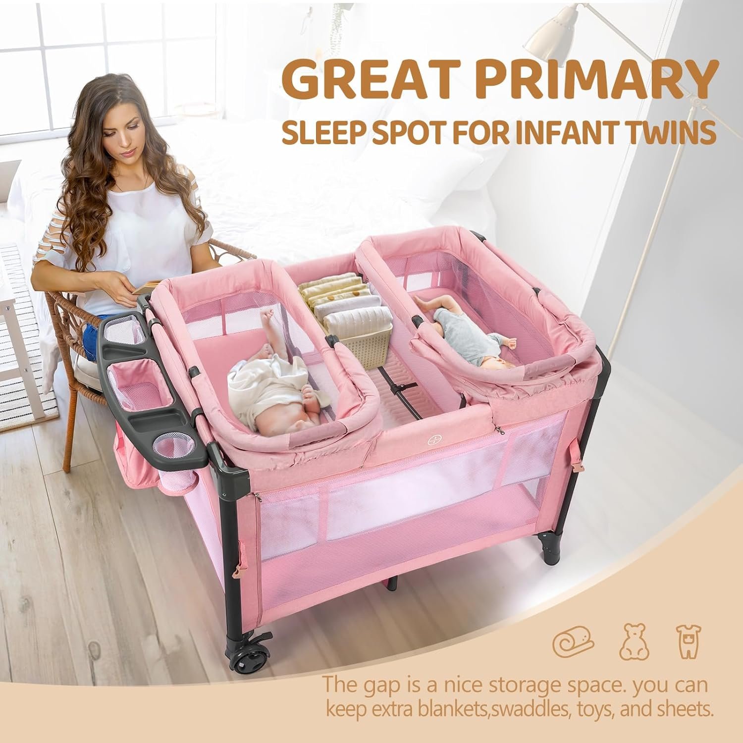 Spacious Storage: Our twin bassinet is equipped with ample storage space, allowing you to keep your babies’ essentials organized and within reach. The storage compartments are perfect for storing diapers, wipes, toys, and more.