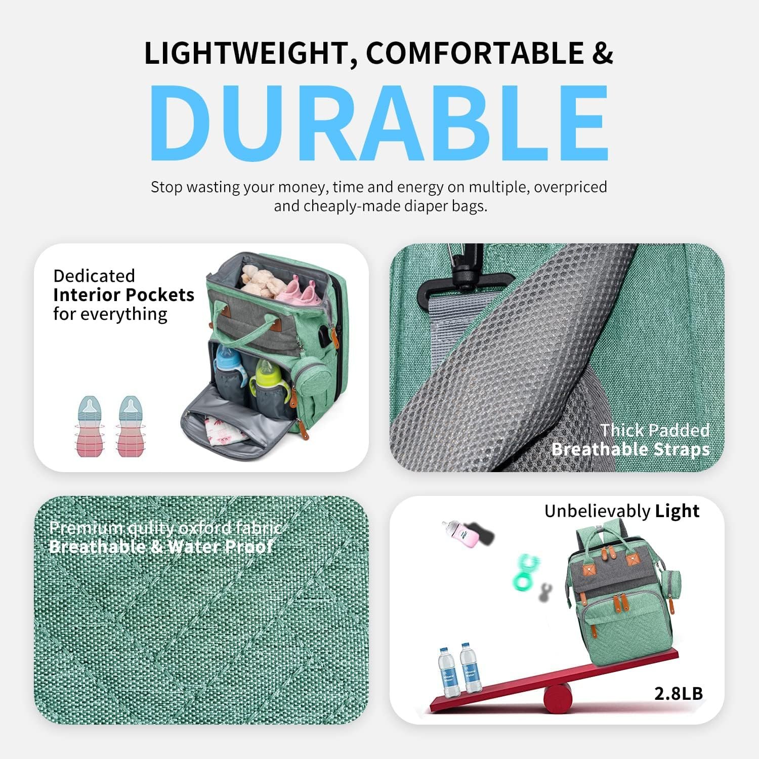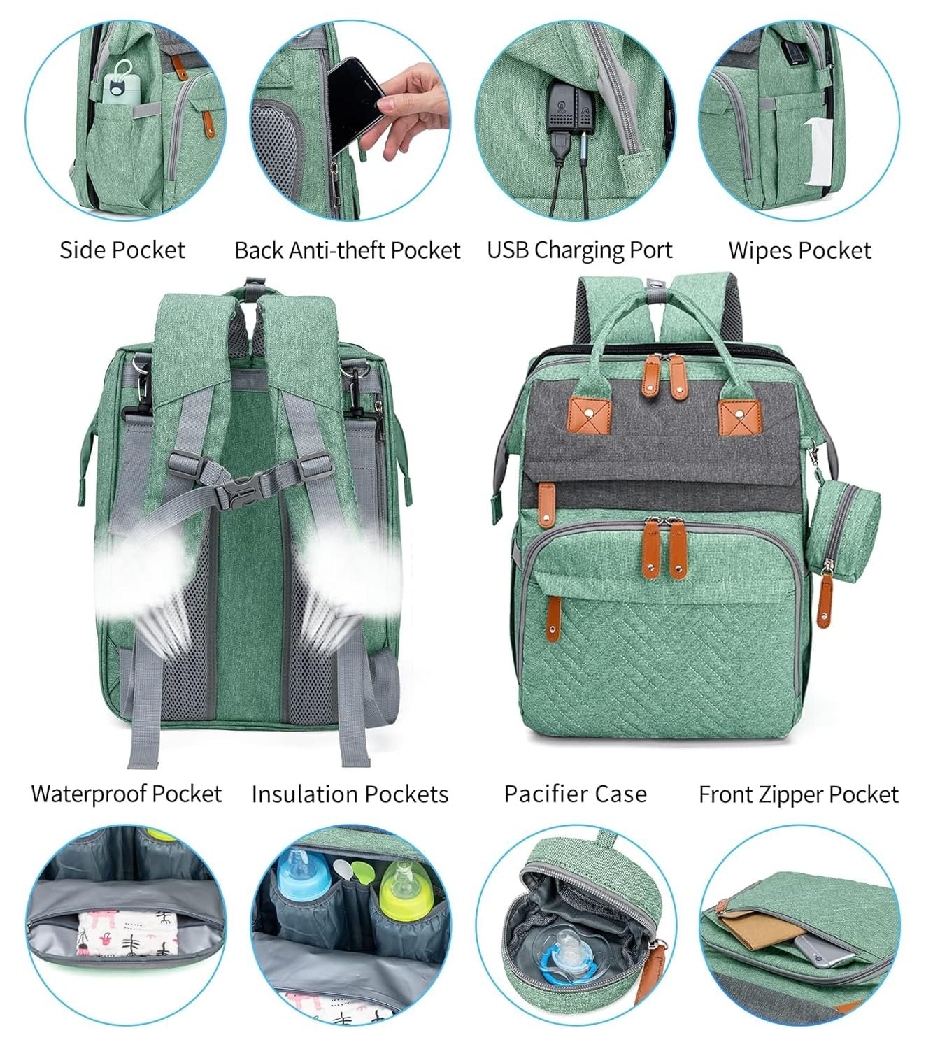 CONVERTIBLE & MULTI-PURPOSE: Stylish and unisex design makes our nappy bag a nice choice for both women and men; This diaper bag can be used as a backpack, handbag, and tote; It also can be hanged on the stroller using the included stroller straps; Elegant and suitable for many occasions like shopping, picnics or traveling (Airport-Friendly Packed Size)