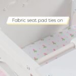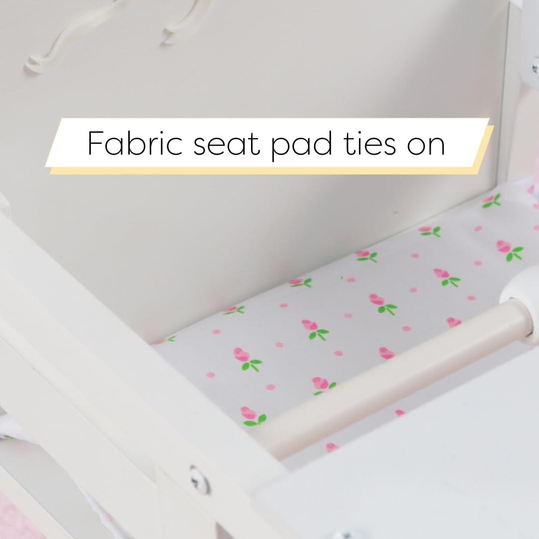 The KidKraft Tiffany Bow Doll High Chair lets kids nurture their 18-inch dolls in style. With classic scalloped trim and ribbon details, this doll furniture item is an elegant addition to playtime. A rose-print fabric pad ties onto the seat for extra adornment. The tray lifts and lowers with rubber stops to keep little fingers safe. The beaded toy bar to entertain “baby” is just like real high chairs. Wooden construction ensures years of delicious mealtime fun. Fits in nicely with other doll furniture pieces for a complete collection. Practice emulating being a parent with the Tiffany Bow Doll High Chair.
