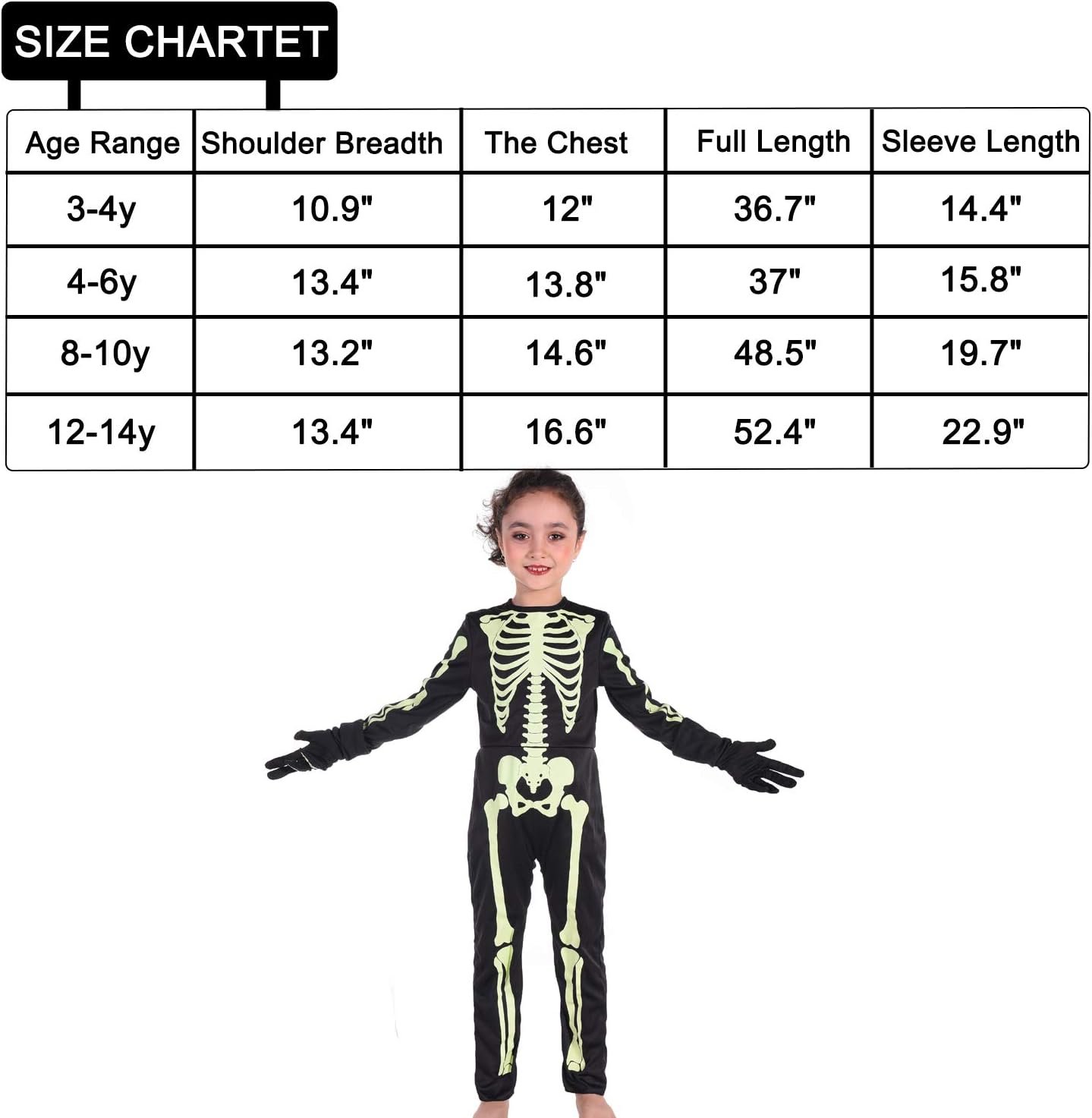 Skeleton costume kids’ size: Skeleton children’s wear shoulder length 13.4 inches, chest 13.8 inches, sleeve length 15.8 inches and the whole clothing length 37 inches. I hope you can measure the children before ordering the exact items.