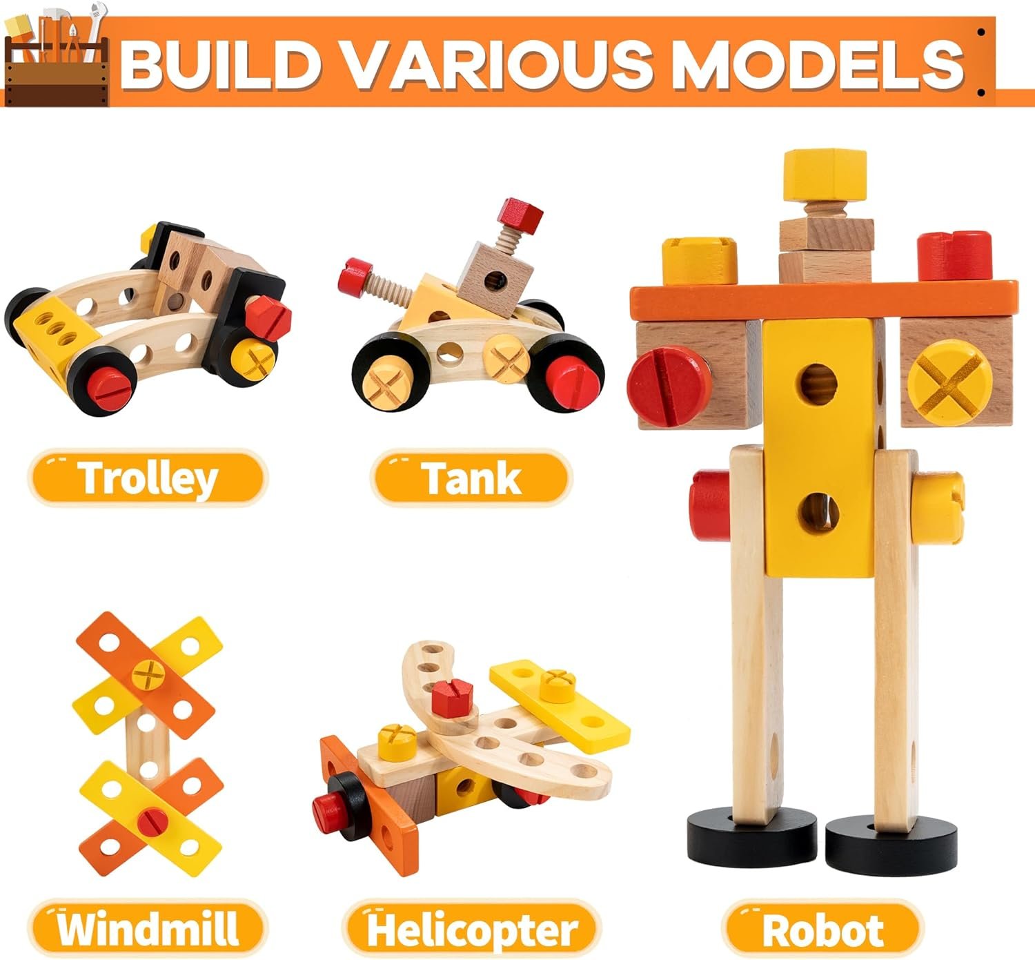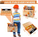 🎁【2-IN-1 DESIGN】This wooden tool kit can be transformed to make a workbench where kids exercise pounding, twisting, sawing, etc, and can also be folded up to keep all the tools and accessories inside for easy storage and carrying.