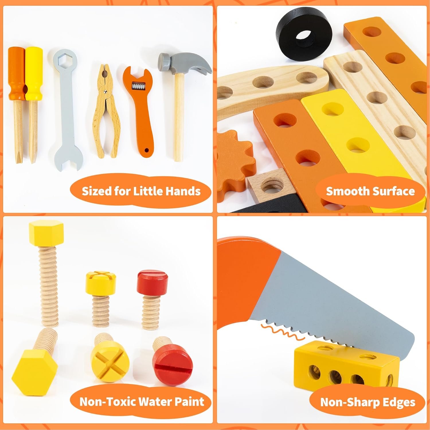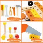 🎁【PERFECT GIFT】The take-along tool kit is made of solid wood and non-toxic finishes. Smooth surface, round corners, non-sharp edges, and perfect size for little hands, these tools are totally child-friendly, making an exceptional gift for your little carpenter.