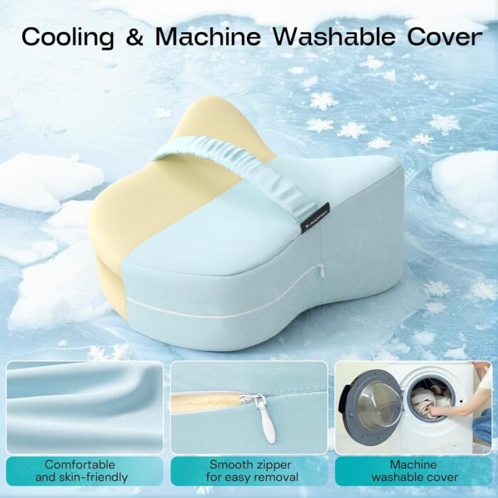 【Cooling Washable Pillowcase】The knee sleeping pillow with cooling ice silk cover dispels stuffy heat and moisture, ensuring a dry and cozy sleep throughout the four seasons. The cover of the sleeping knee pillow with a big smooth zipper could be easily removed and is machine washable. The memory foam core of this cooling knee pillow can NOT be washed!
