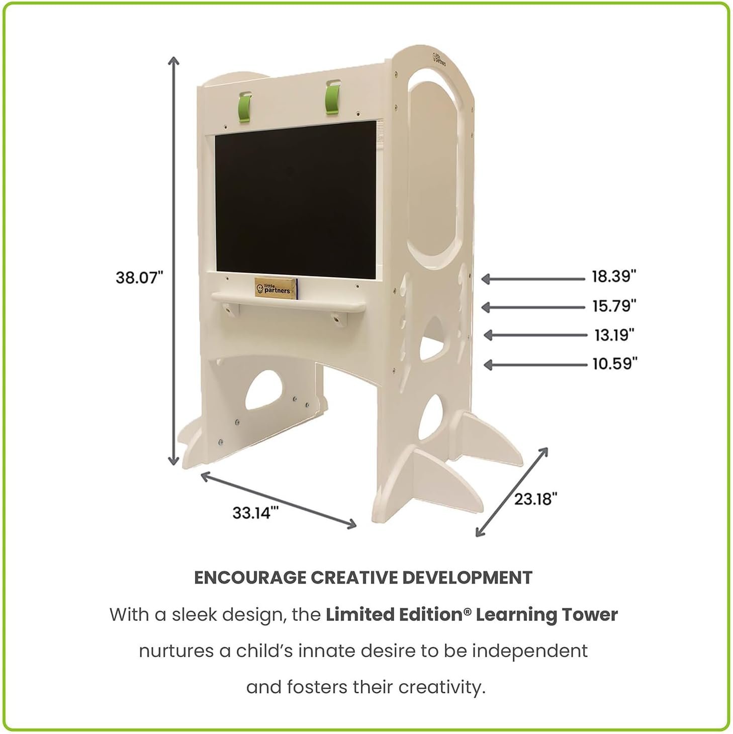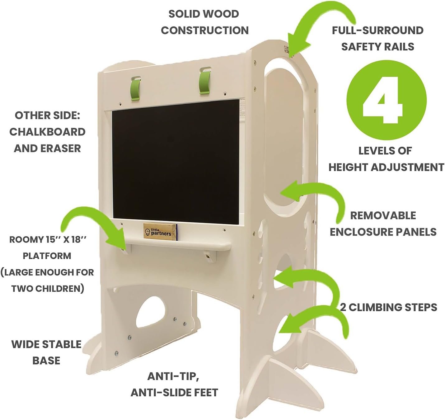 Adjustable Height – Little Partners step stool and writing surface features 4 levels of height adjustment to grow with your little one (Level 1: 10.59”, Level 2: 13.19”, Level 3: 15.79”, Level 4: 18.39”)