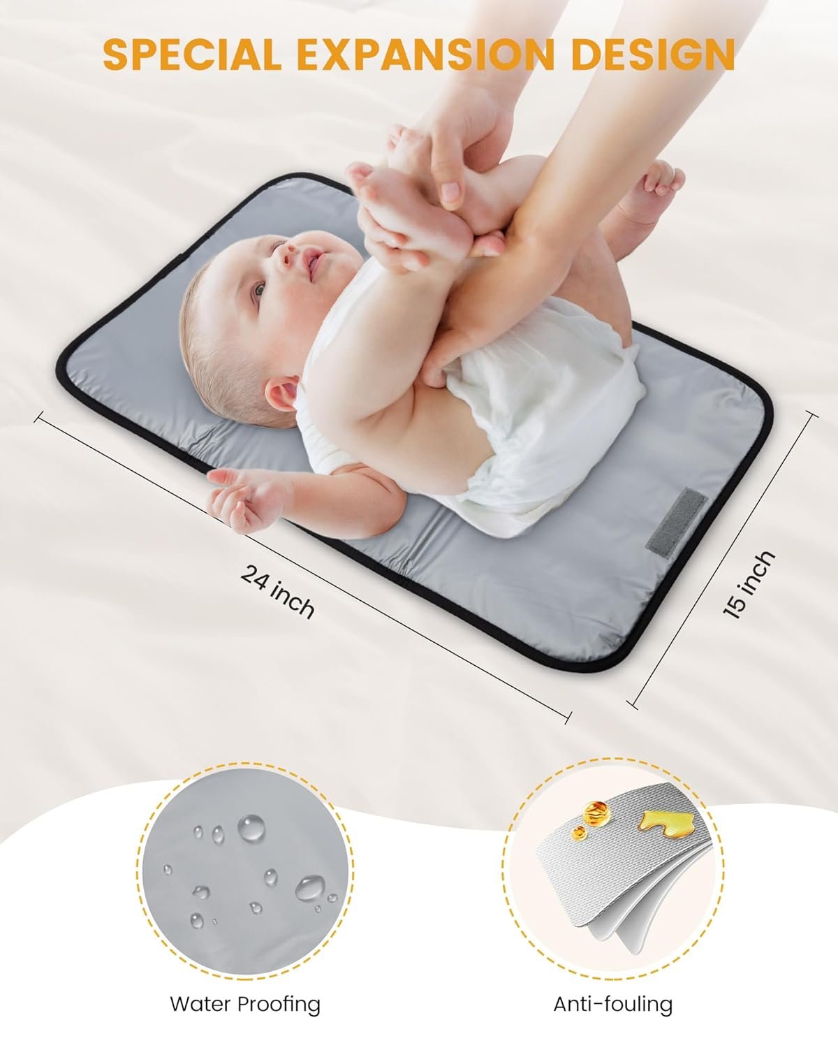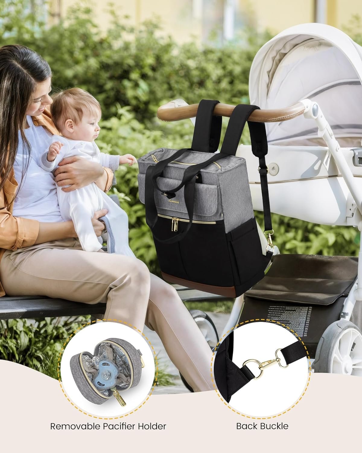 【Portability】The extra-wide opening and easy-sliding double zipper allow for quick one-handed access. The easy-to-access metal buckle makes it easy to secure the baby diaper bag to any stroller. Portable diaper pads hold everything mom and dad need to keep their babies clean, dry and happy, as well as a removable pacifier holder for organizing baby pacifier case or other essentials.