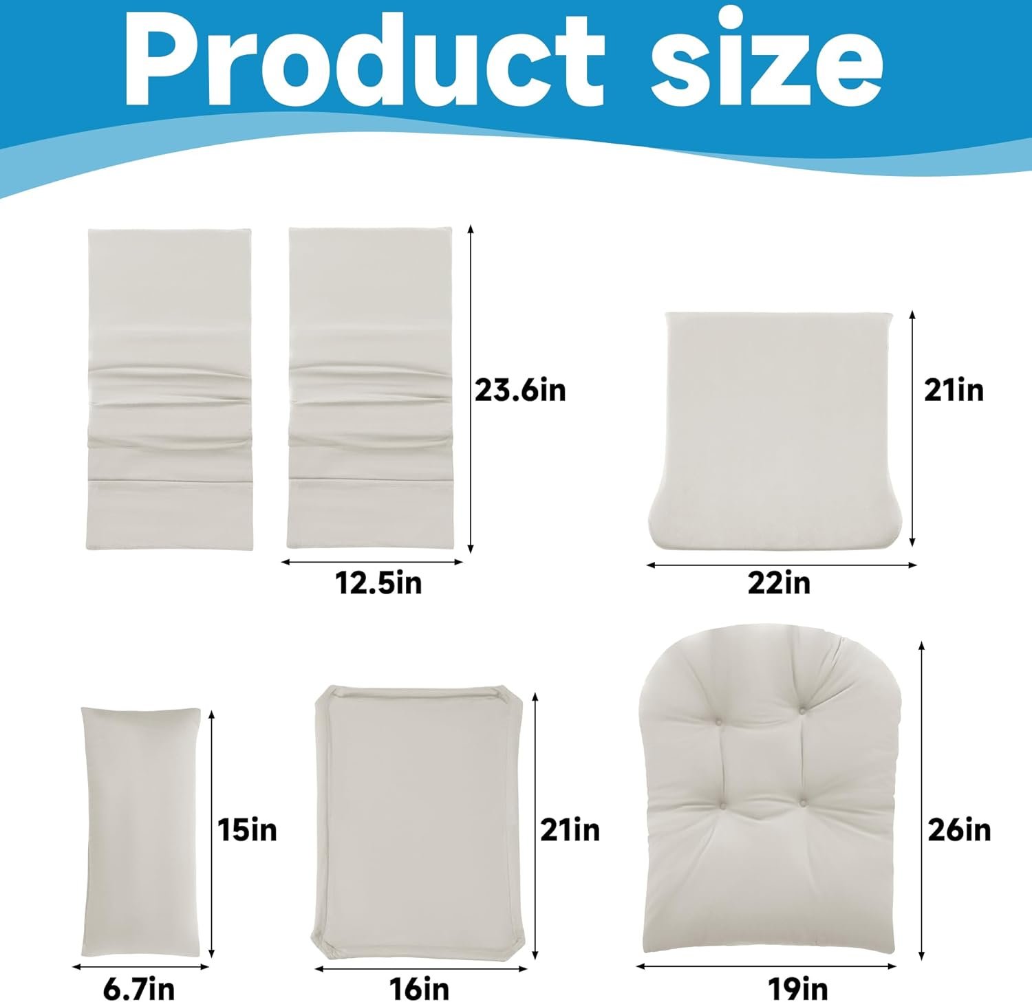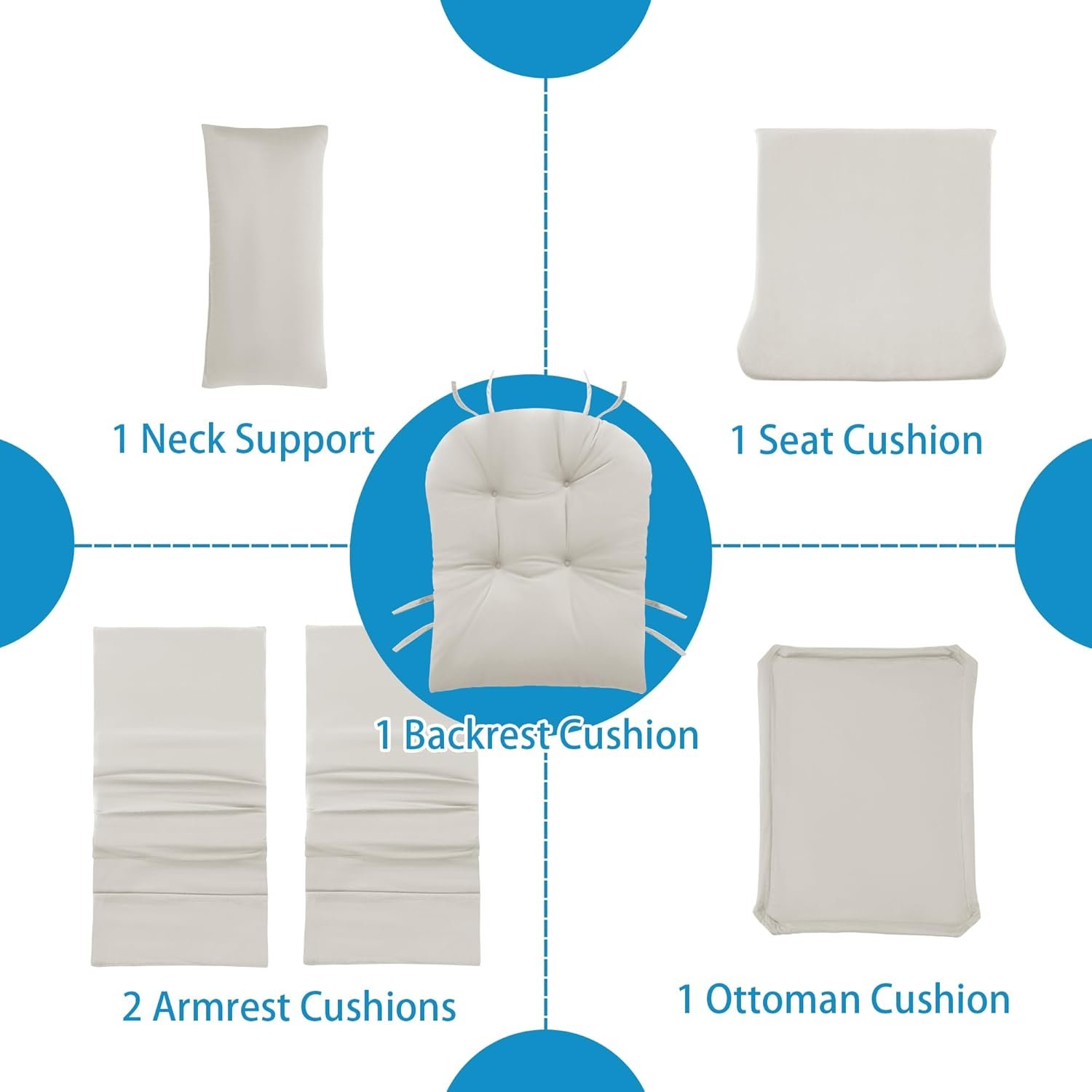 【Set Information】(NO Gliding Chair Included) Include 6 pieces. 1 backrest cushion (26*19 inches). 1 seat cushion (22″*21″*2.8″). 1 ottoman cushion (21″*16″). 2 armrest cushions (12.5″*23.6). 1 neck support (15″*6.7″)