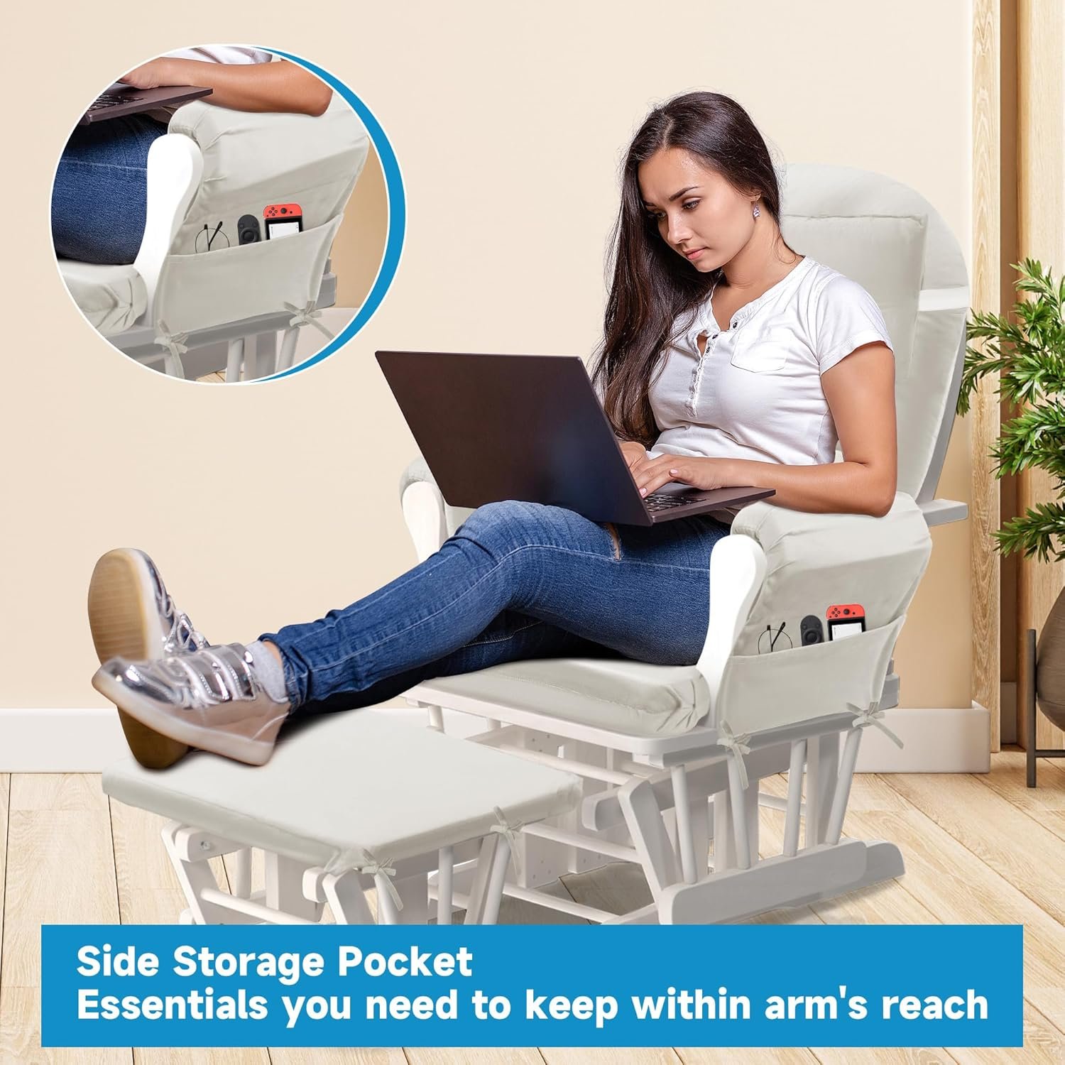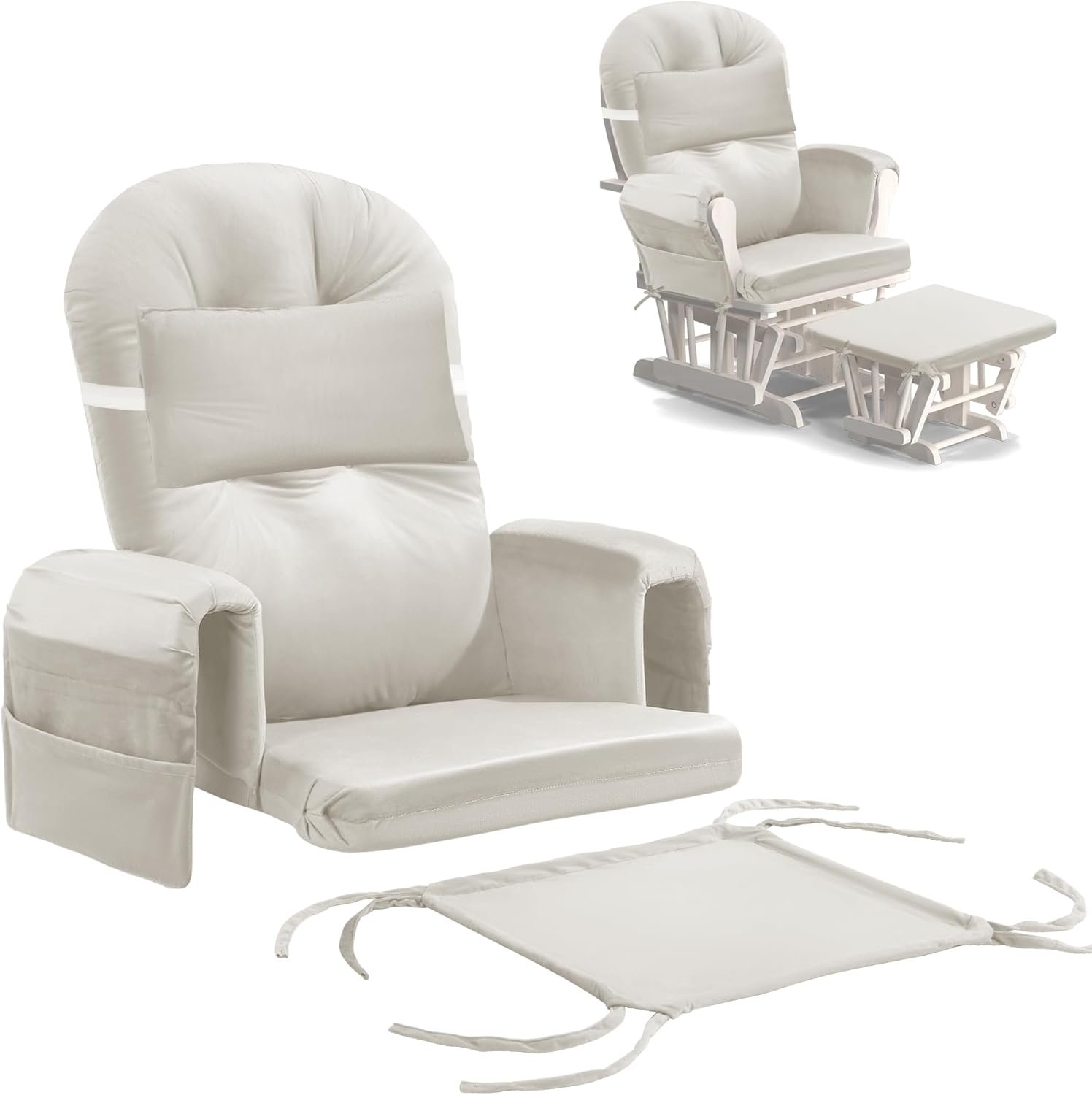 【Ingenious Storage Design】 The glider rocker replacement cushion comes with storage side pockets to support your arms and conveniently store books, toys, magazines, TV remotes, and other small items to keep you on the go. Ottoman cushion replacement cover with 4 straps are easier to secure and avoid accidental sliding.