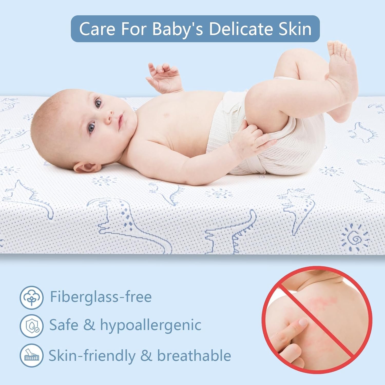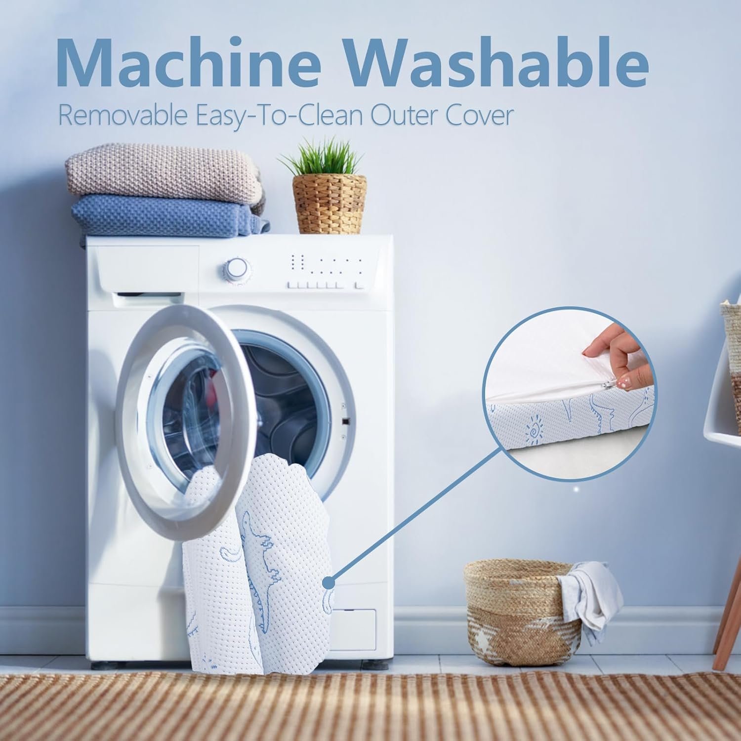 Comfort to Sleep: The outer cover of the mattress for pack n play is made of ultra-soft breathable fabric, providing a cool and comfortable surface for your baby to sleep and play on. And with the zipper design the cover is removable for machine washable, which is easy to keep your baby mattress clean. The delightful dinosaur patterns on the cover also add a lovely touch to your nursery