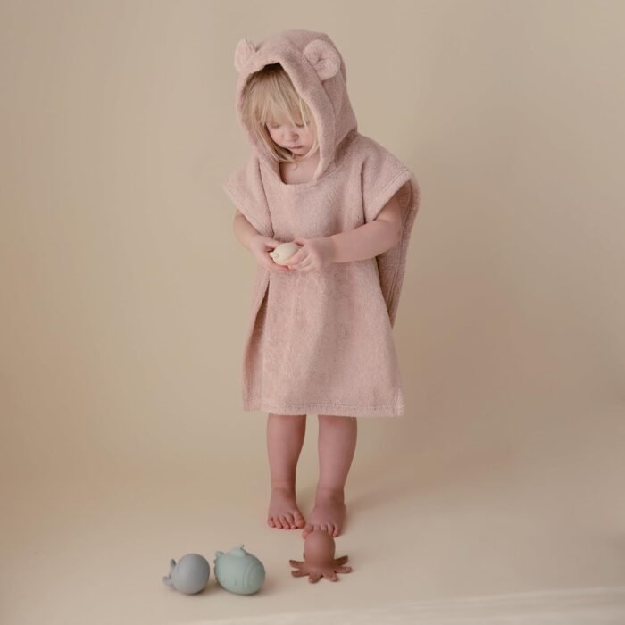 Made from 100% organic cotton, our poncho towel is gentle on sensitive skin and perfect for cozy cuddles after bath time or a swim.