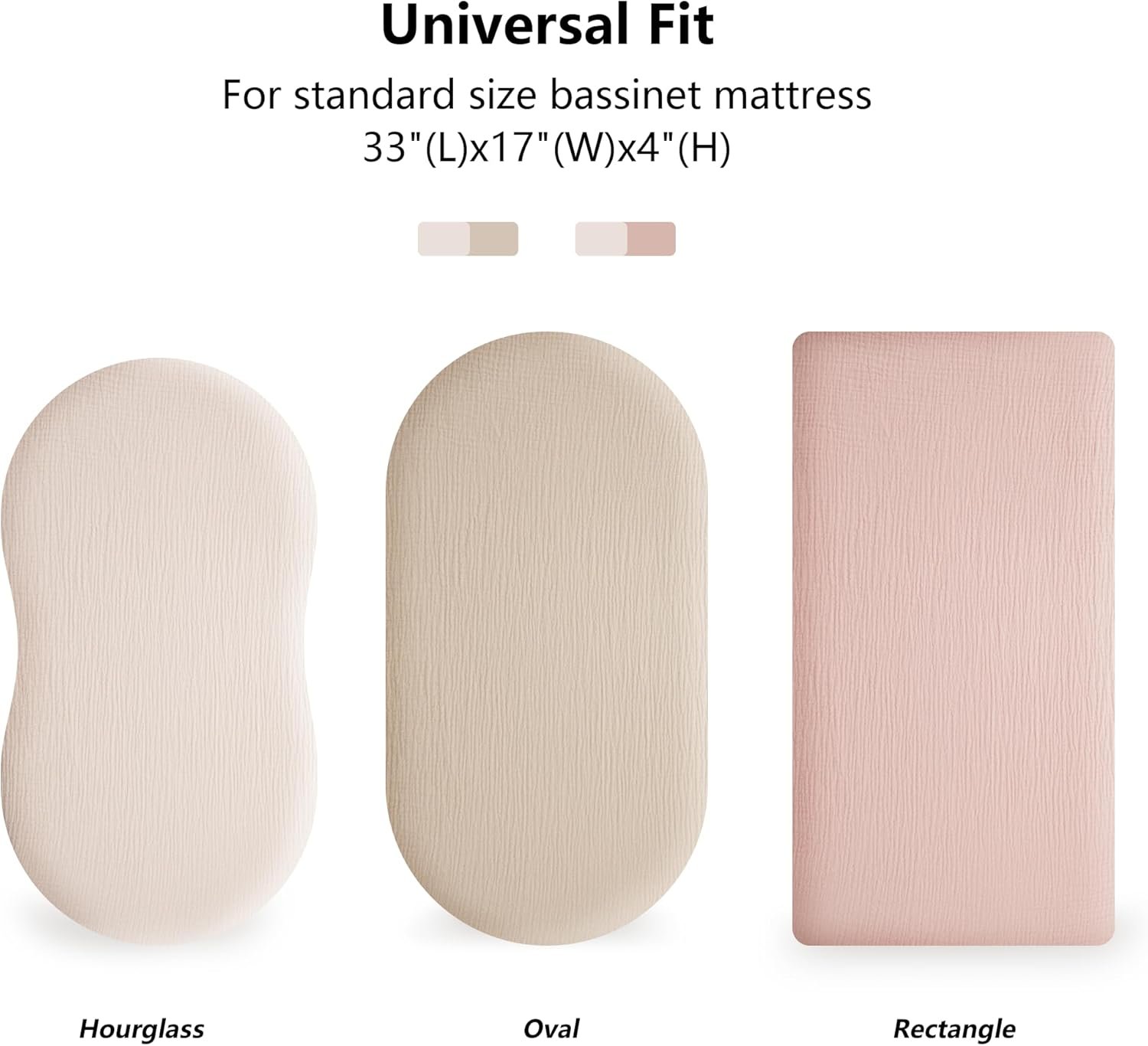 Discover MairMore’s Universal Fit Baby Bassinet Sheets. Designed to accommodate standard bassinet mattresses and various shapes—hourglass, oval, or rectangle—our sheets provide a snug and secure fit for your baby’s peaceful slumber.