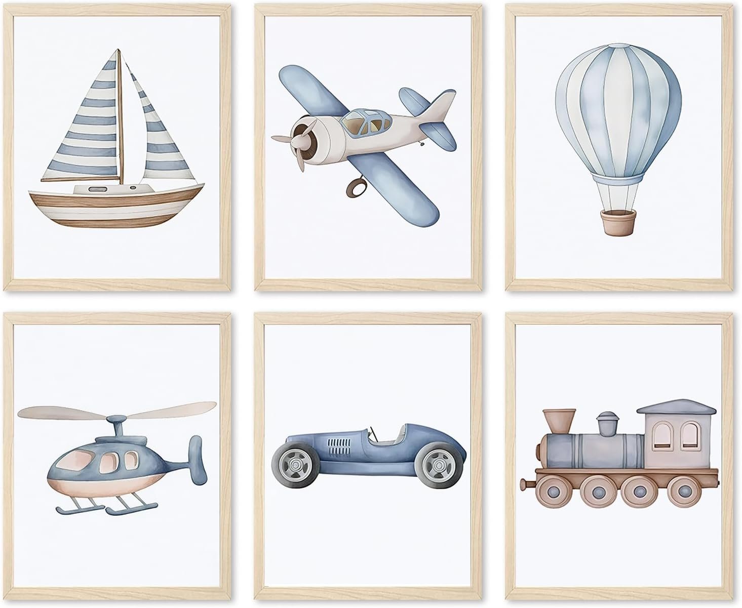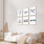 Baby Boy Nursery Poster: Introduce a world of adventure to your child’s room with this baby boy nursery decor. Featuring classic vehicles like cars, trains, planes, boats, and hot air balloons, these artworks add a whimsical touch to nurseries and kids room