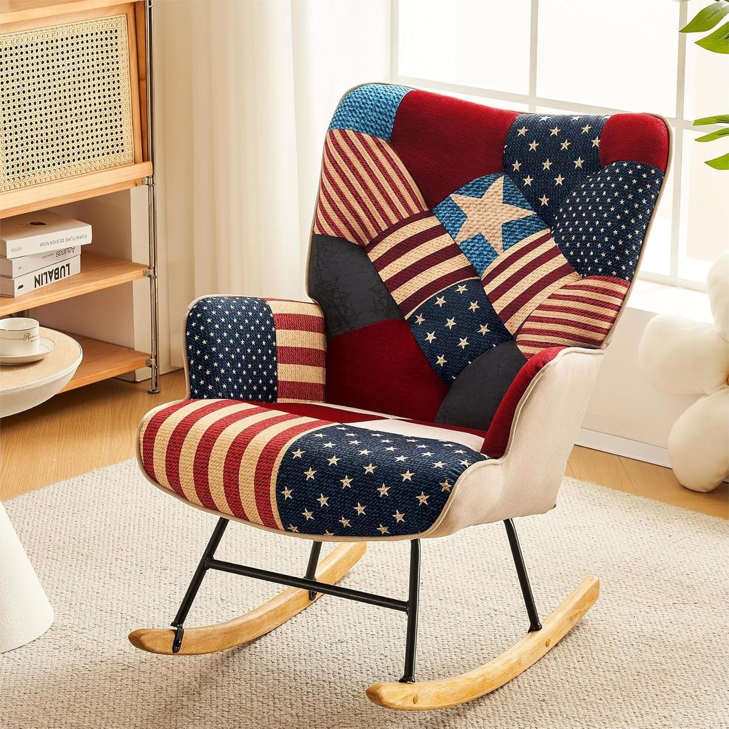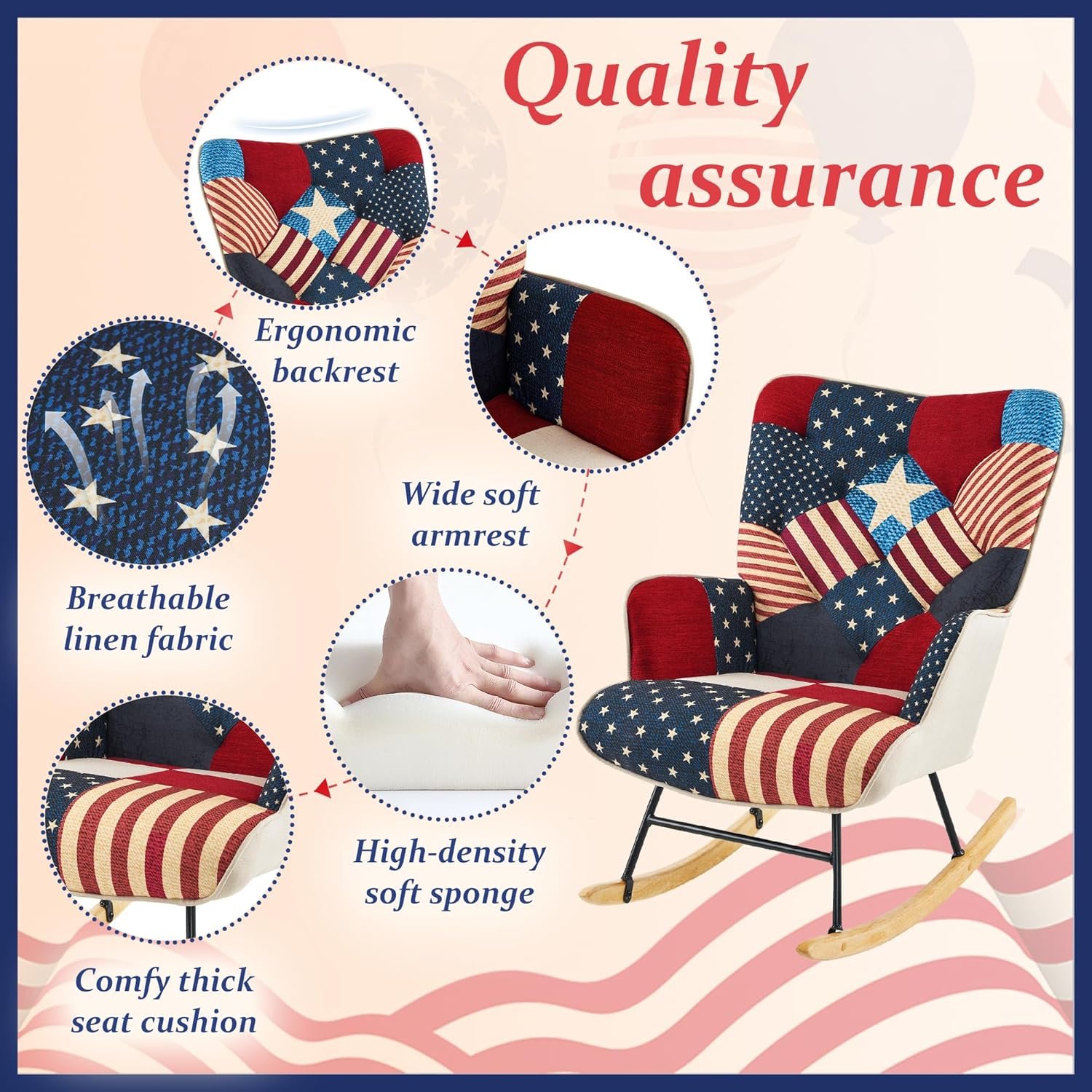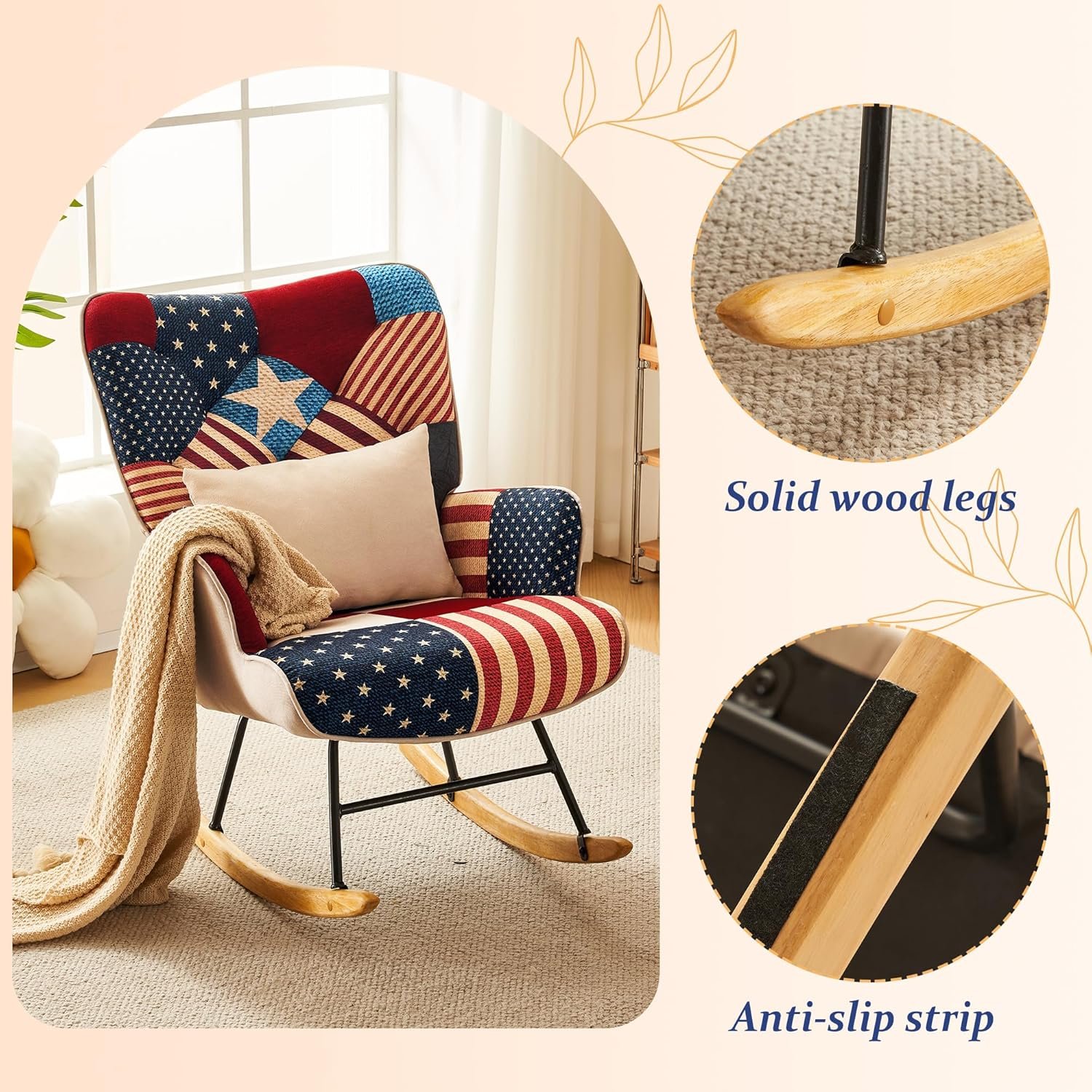 UNIQUE PATCHWORK FABRIC: The rocking chair for nursery is meticulously crafted with patchwork linen fabric, adding an element of artisanal charm to any space. The fabric is durable and will not fade, wrinkle or pill after long-term use.