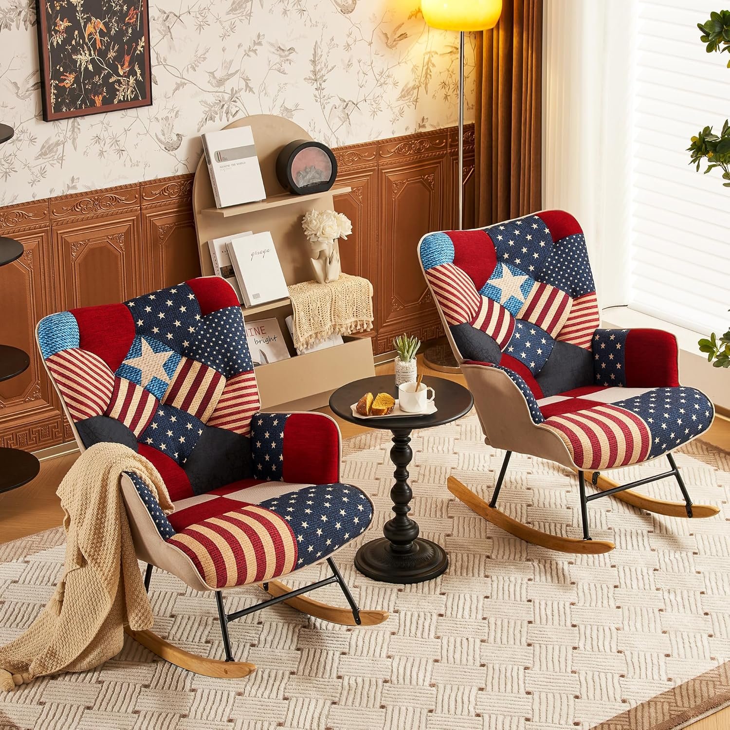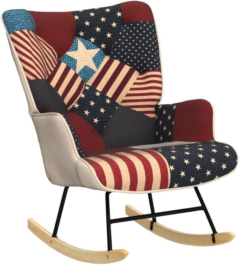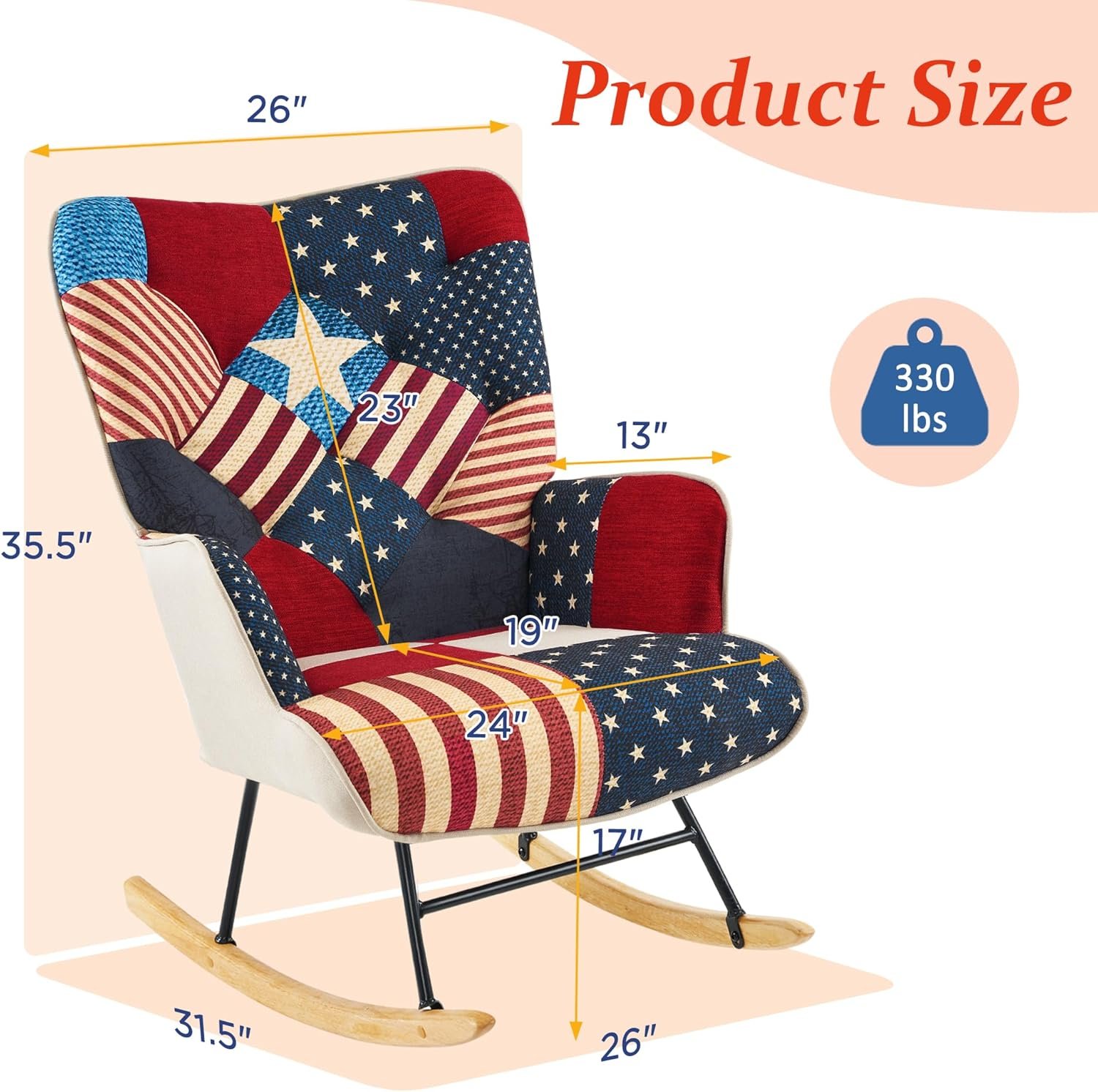 UNIQUE PATCHWORK FABRIC: The rocking chair for nursery is meticulously crafted with patchwork linen fabric, adding an element of artisanal charm to any space. The fabric is durable and will not fade, wrinkle or pill after long-term use.