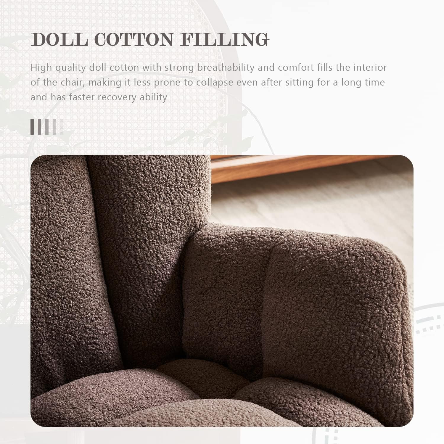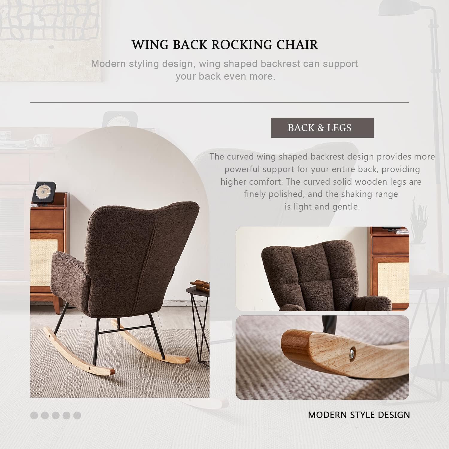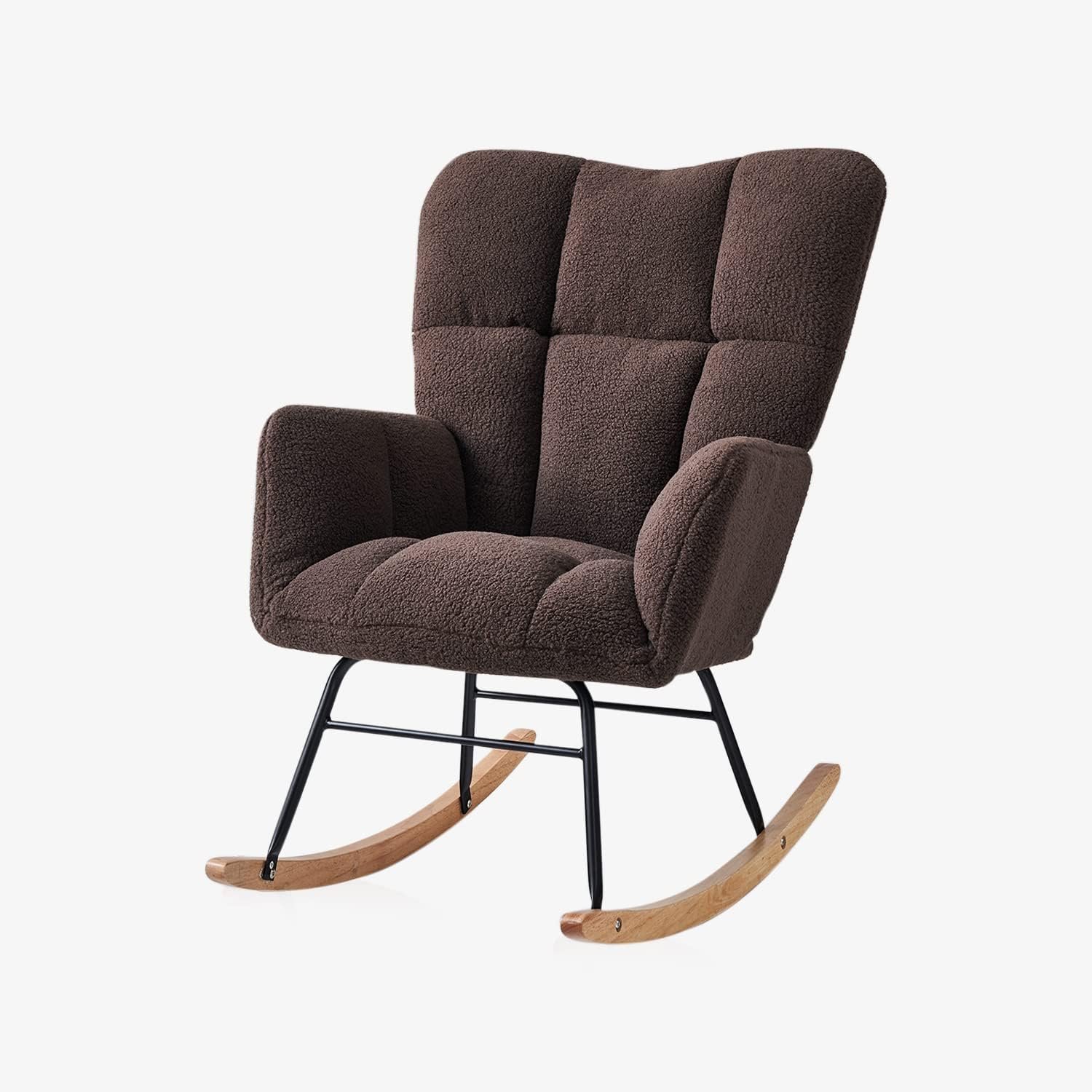 Premium Quality: The surface of the modern rocking chair is made of soft teddy bear fabric, which is gentle on the skin, comfortable and soft. The high backrest and thick seat cushion are filled with high-density sponge, which is soft, elastic and not easy to collapse. A rocking chair soft enough to let you relax after a tiring work day.