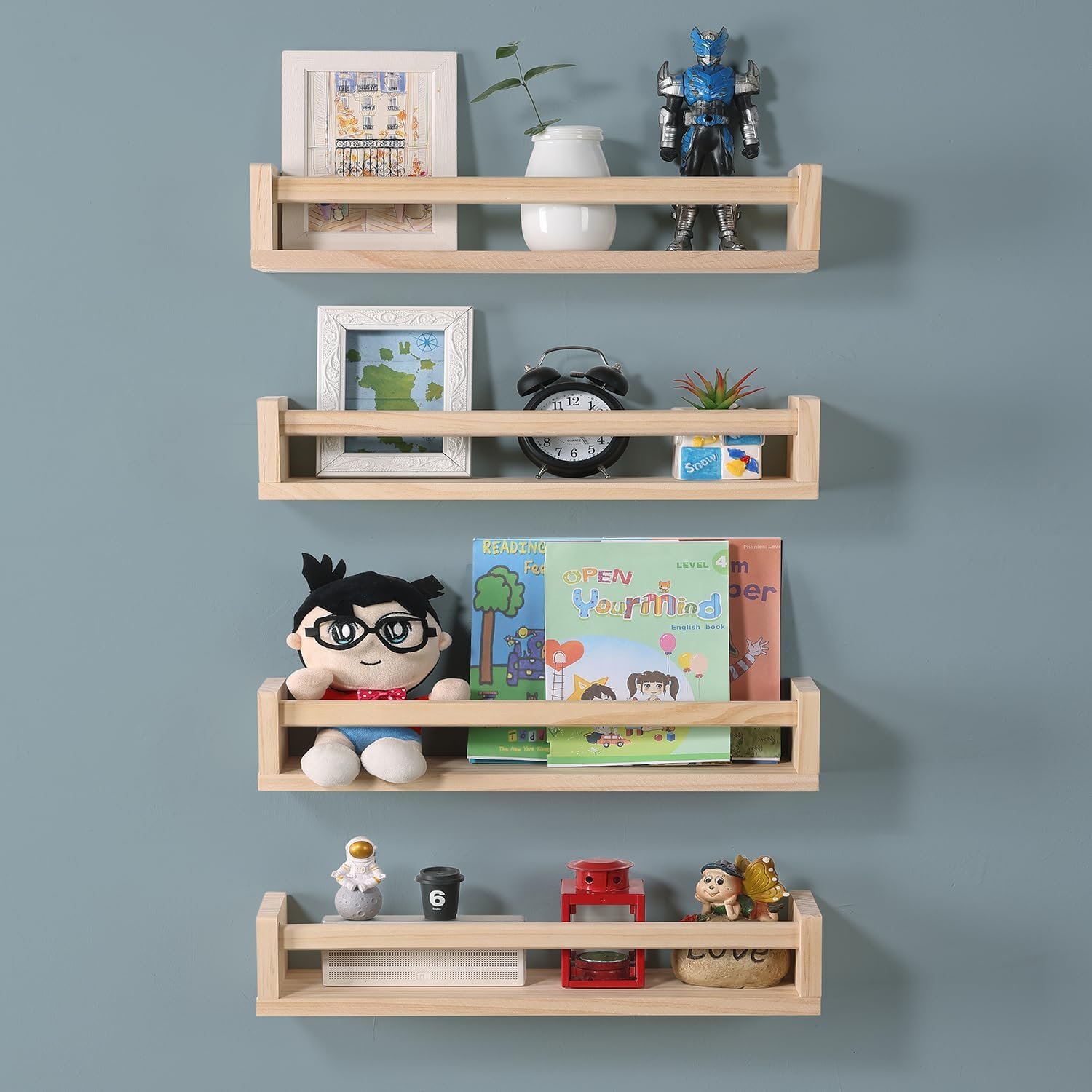 What You Get: As a professional nursery shelf manufacturer. We’re offering you a durable, classic, and functional kids book shelf. You’ll get 4 well-designed shelves of the same size. Dimension:16.5L x 3.5H x 4.0W inches.
