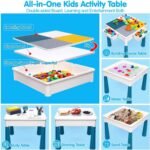 All in One Kids Activity Table: Kids table and chair set comes with 2 chairs and a reversible top for building blocks or learning, even eating meals. With leak-proof design, also used as water table or sand table. Deep table body and 4 bins, brings super capacity for storage table without mess. What a versatile table for kids multiple activities