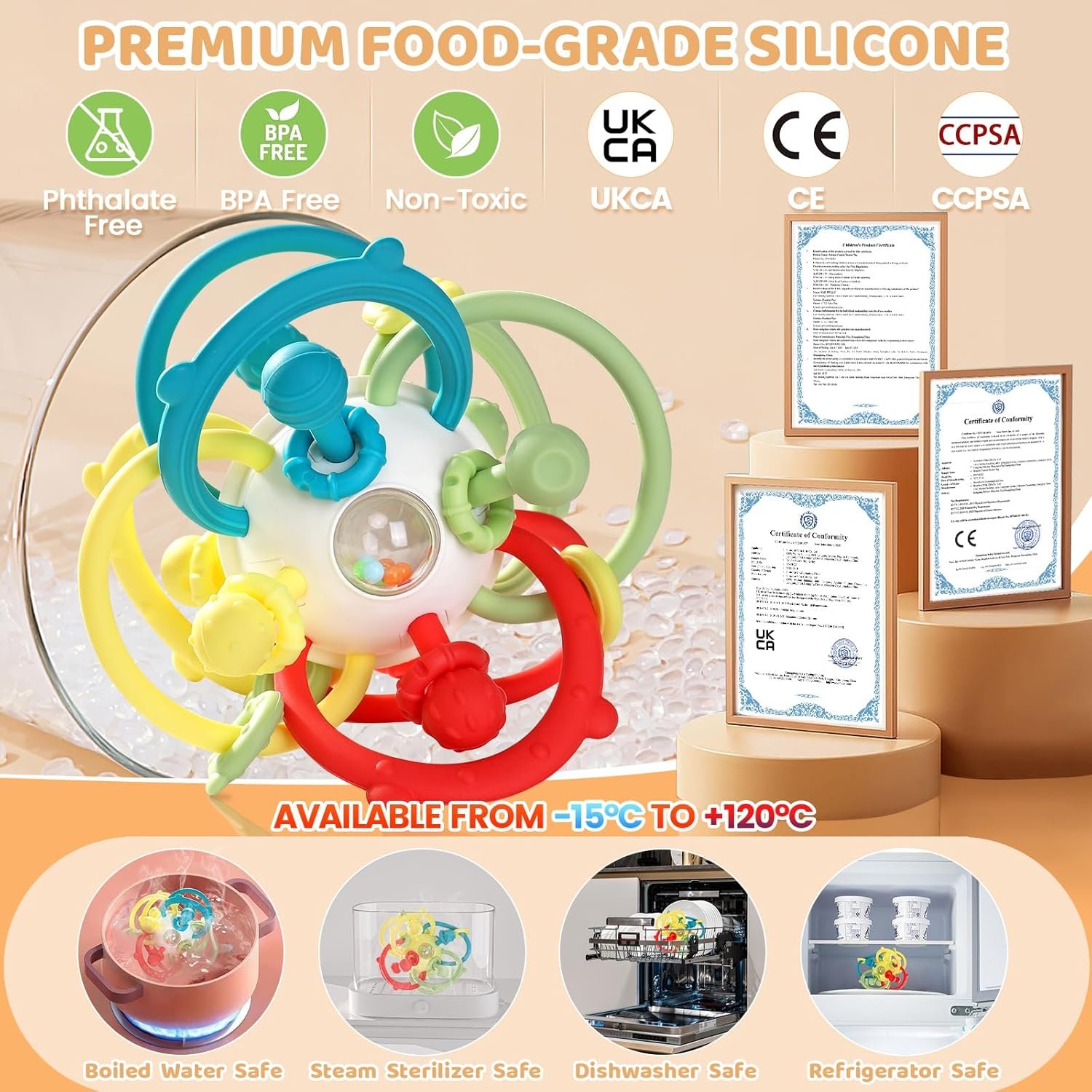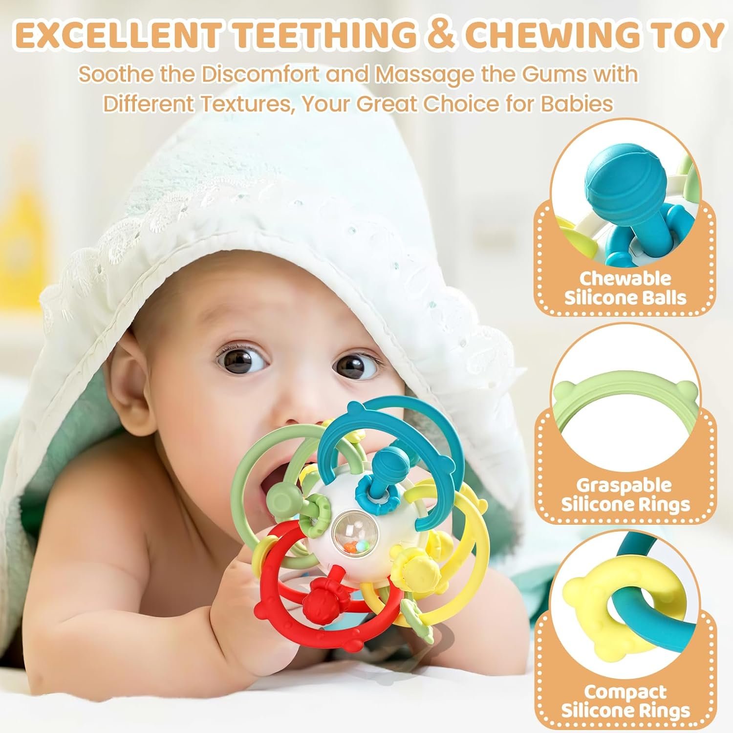 🍼 𝐑𝐄𝐋𝐈𝐄𝐕𝐈𝐍𝐆 𝐓𝐄𝐄𝐓𝐇𝐈𝐍𝐆 𝐃𝐈𝐒𝐂𝐎𝐌𝐅𝐎𝐑𝐓: Equipped with 8 colorful silicone balls with different textiles, Orzbow Teethers Toys for Babies can soothe and massage the gums well with different feelings, exercise the baby’s ability to chew and bite and greatly provide fun, which is 𝐝𝐢𝐬𝐡𝐰𝐚𝐬𝐡𝐞𝐫 𝐚𝐧𝐝 𝐫𝐞𝐟𝐫𝐢𝐠𝐞𝐫𝐚𝐭𝐨𝐫 𝐬𝐚𝐟𝐞 (𝟱℉ 𝐭𝐨 𝟮𝟰𝟴℉), your ideal choice for 3-12 months baby’s early development, making parenting easier.