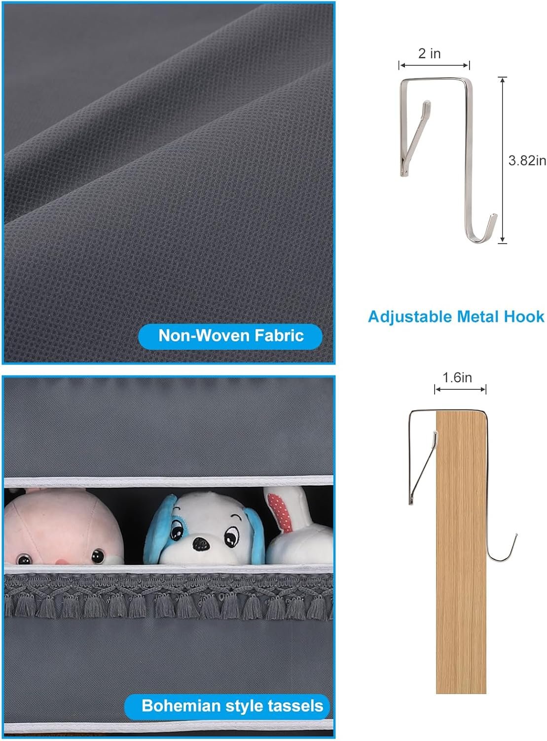 The total size of this door organizer is H 50in *L 16in *W 6in. Metal hooks fit doors less than 1.75 inches thick