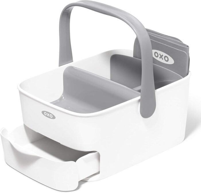 Never be caught without something you need during a diaper change. The OXO Tot Diaper Caddy with Changing Mat is a convenient way to store everything from diapers and ointments to wipes¬ and burp cloths. A generously sized, comfortable folding Mat fits right inside, so you can change baby anytime, anywhere. The wipes compartment holds a wide variety of wipes dispensers, and the drawer holds even more accessories. The locking handle makes it easy to grab and go, meaning you’ll be ready for any diaper emergency.