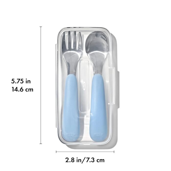 The OXO Tot On-the-Go Fork & Spoon Set was designed for meals while out and about—whether that’s a picnic in the park, at school or just in the backyard. The stainless steel Fork tines are rounded (to protect little fingers) but can still spear food, and the matching Spoon is extra-deep for optimal scooping. The curved, non-slip handles are easy for learning hands to hold and feature a flat spot to keep the utensils from rolling away. Plus, the compact travel case can be easily tucked into lunchboxes, diaper bags, purses or pockets. Dishwasher safe.