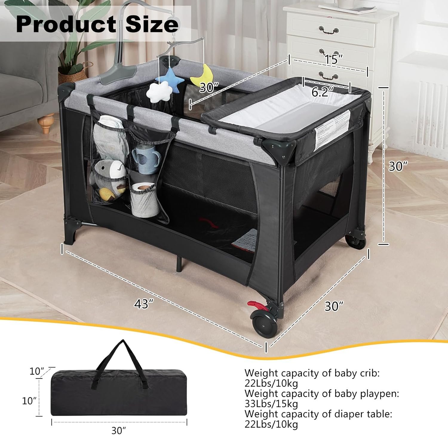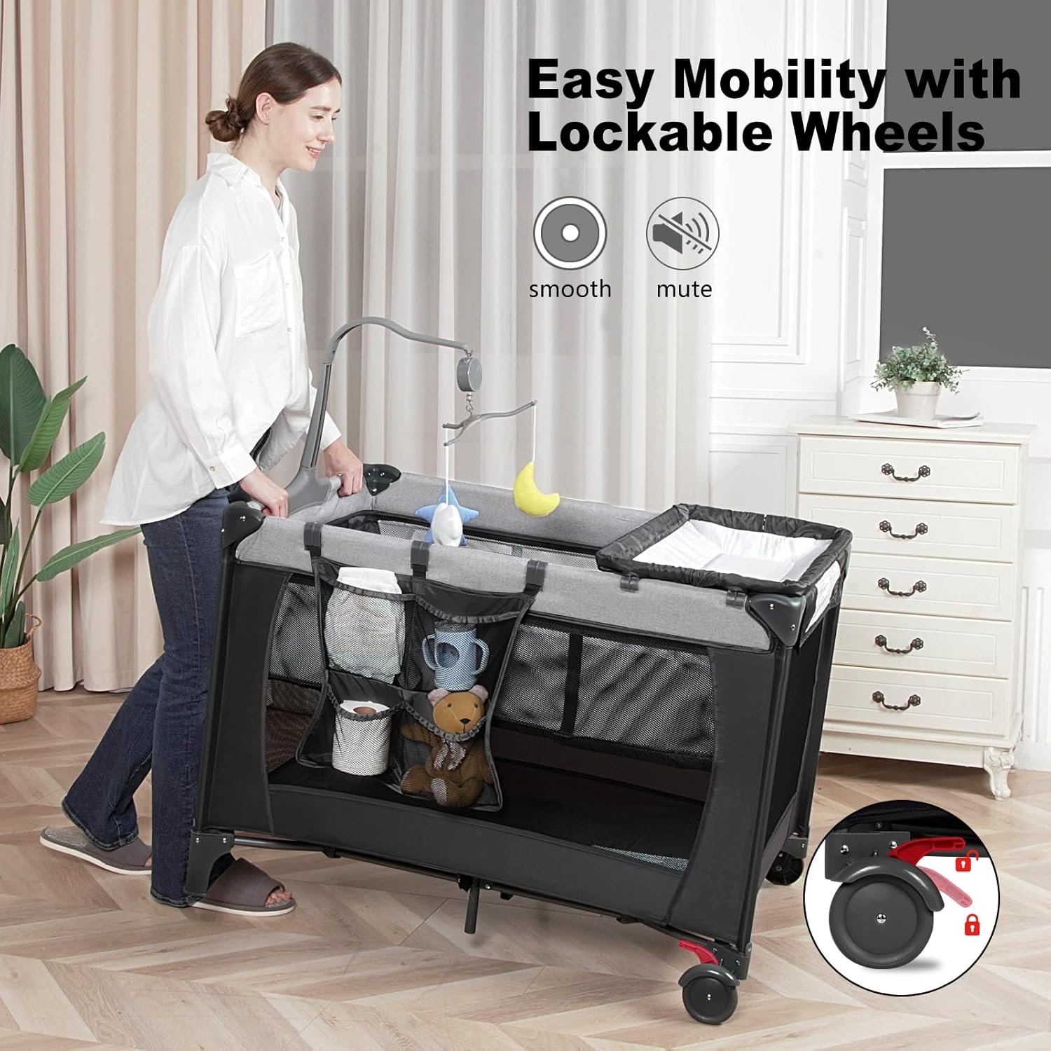 【Complete Travel-Ready Bundle & Giftable Set】Includes mattress pad, music box, universal wheels, storage basket, and chic carry bag. Designed to grow with your child up to 6+ years, making it the perfect baby shower or new parent gift.