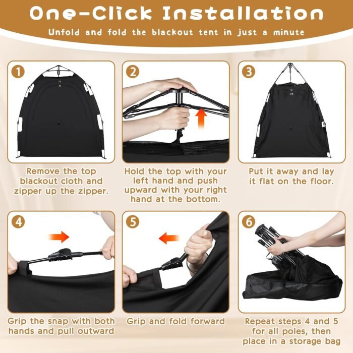 One Click Installation:The pack and play cover blackout is easy to install, all you have to do is take the sleep pod out of the storage bag and place it on the floor, press down firmly on the top fixing and it will be installed in seconds
