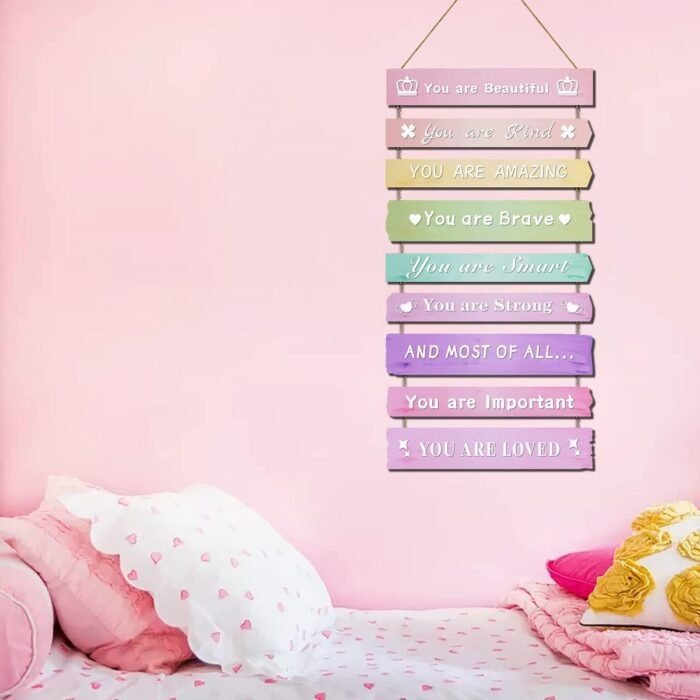 The girl room decor is printed with many warm and inspiring motivational words, [You are Beautiful, You are Smart, You are Important, You are Kind, You are Strong, You are Brave, You are Amazing, AND MOST OF ALL…, YOU ARE LOVED], which quietly encourage people, great for kids, teen girls, baby girl, toddlers, women.