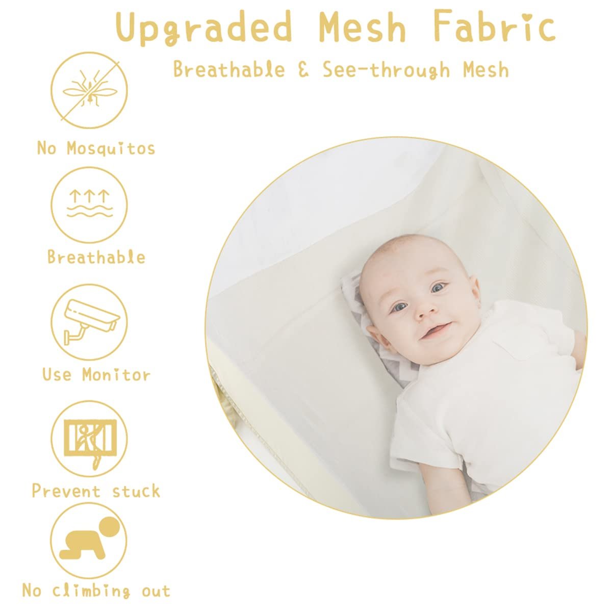 Air circulation: The mesh features 1200 holes/inch so it will be denser to keep out mosquitoes/insects/cats. And the pack n play cover is breathable to allow full air circulation, thus ensuring your baby’s comfort and health