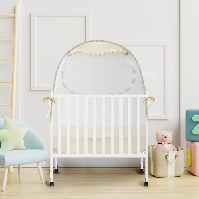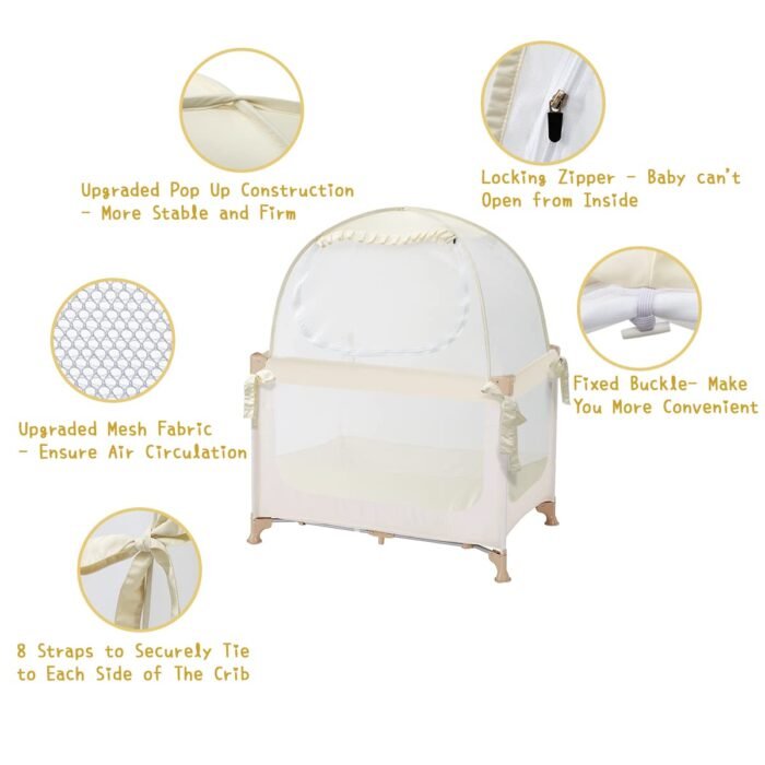 Simple pop-up setup: The pop-up structure enables you to install this baby crib tent in seconds by two steps: unpack the tent and place it on the crib. Then you just need to tie the straps to the guardrail for added stability