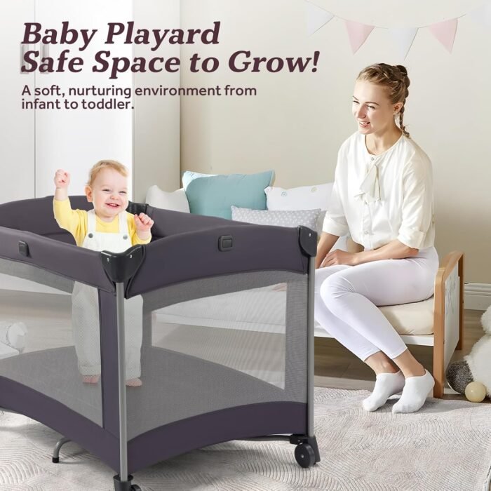 4 in 1 Playard – GEGOSEN baby play yard combines a playpen, baby nap bed, newborn bassinet and nappy changing table all in one with a large storage bag. It is fully functional and cost effective.