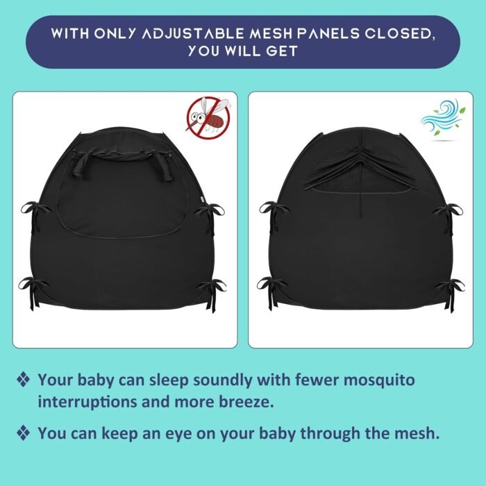 ❤Meticulous Design – A large window makes it easy for you to put your baby inside. The 4 ventilation windows and mosquito net let air in and mosquitoes out. Equipped with 2 pockets for fans and wireless monitor placement so you can keep an eye on your little one.
