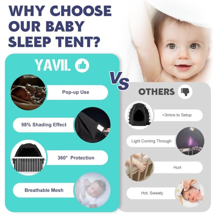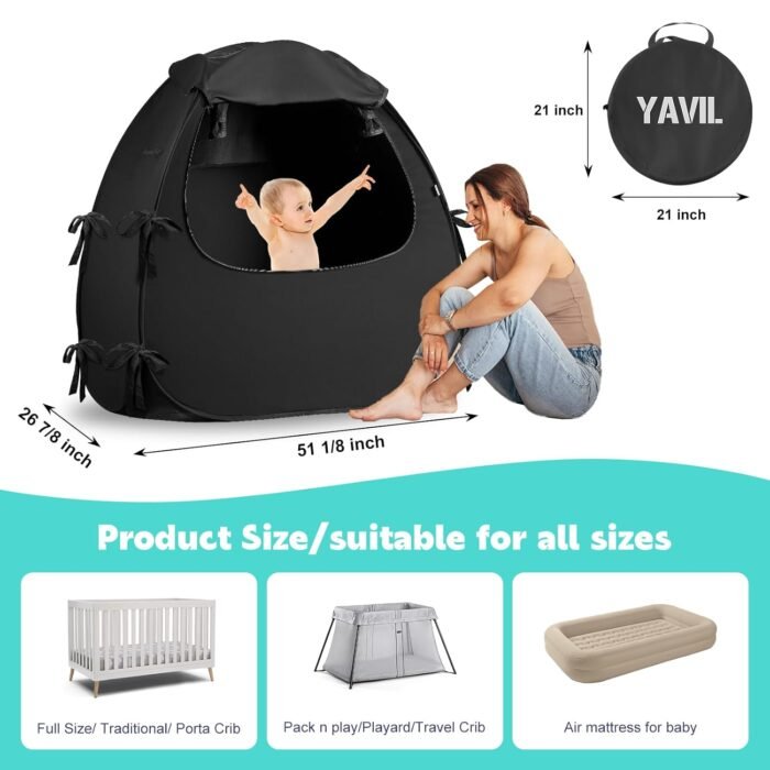 ❤Travel baby essentials – Yavil creates a dark and peaceful sleep pod for infants and toddlers to keep them sleep SAFE & SOUND even in bright or unfamiliar surroundings. Our baby blackout tent blocks out over 90% of light, which helps baby to get better rest and solve family vacation problem.