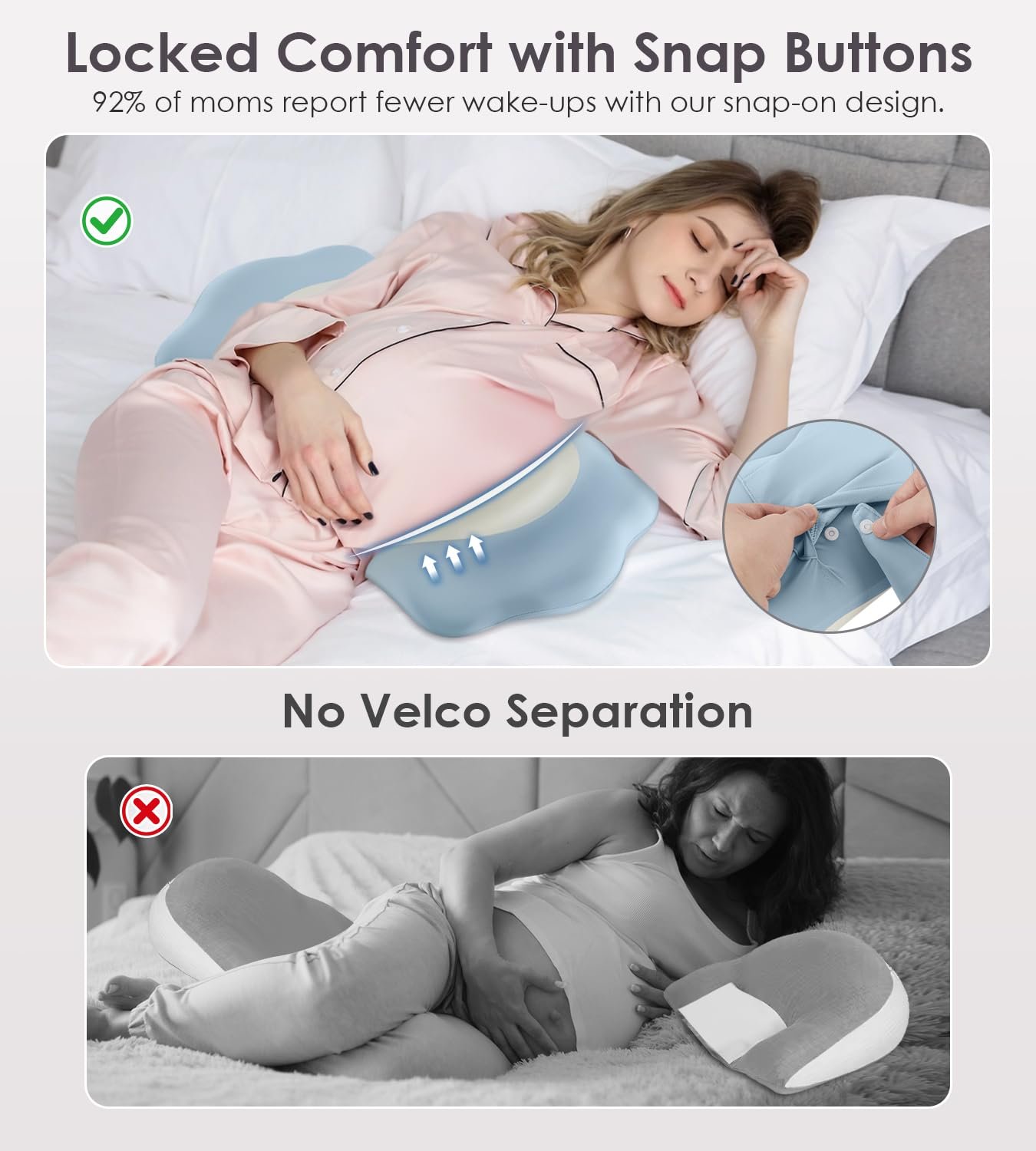 ✅Secure Snap-On Design + Easy Care: No more midnight pillow collapses! This side sleeping pregnancy pillow with durable snap buttons (vs. flimsy Velco) keep the pillow firmly in place—92% of moms report fewer wake-ups. The machine-washable cover saves time, and the foam core resists flattening for years.
