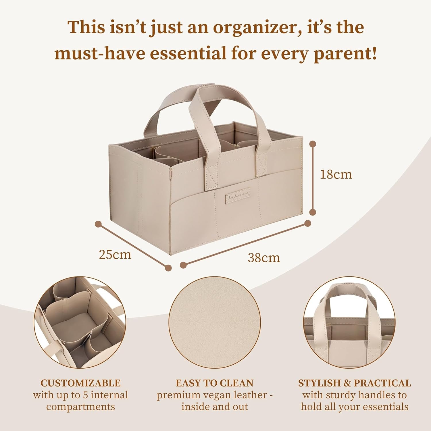 [HANDCRAFTED FROM PREMIUM VEGAN LEATHER] – Thoughtfully designed by parents, our diaper caddy is made from 100% high-quality vegan leather for a luxurious, durable, and easy-to-clean finish. Built to hold wipes, toys, and other baby essentials without losing its shape, this sturdy organizer effortlessly handles everyday messes—just wipe clean and go.