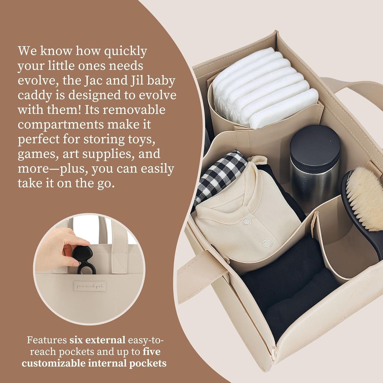 [CUSTOMIZABLE REMOVABLE DIVIDERS] – Designed to grow with your child, this versatile caddy features 4 sturdy, high-quality Velcro-secured dividers that can be rearranged or removed to suit your changing storage needs. Whether organizing newborn essentials or toddler gear, enjoy a tailored solution that adapts seamlessly to every stage. Our caddy also features 6 external compartments to store easy to reach essentials.
