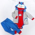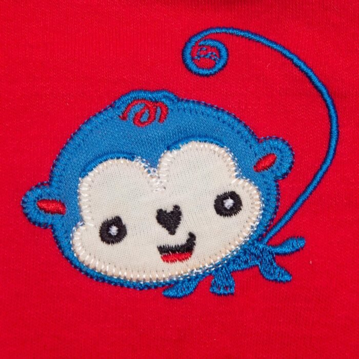 The color of the clothes is shown in the picture, Blue and red dress.The clothes were printed with a pattern of monkey.The white coat was striped with gray, and the blue hat was on it.