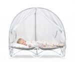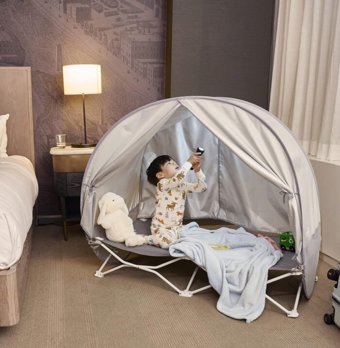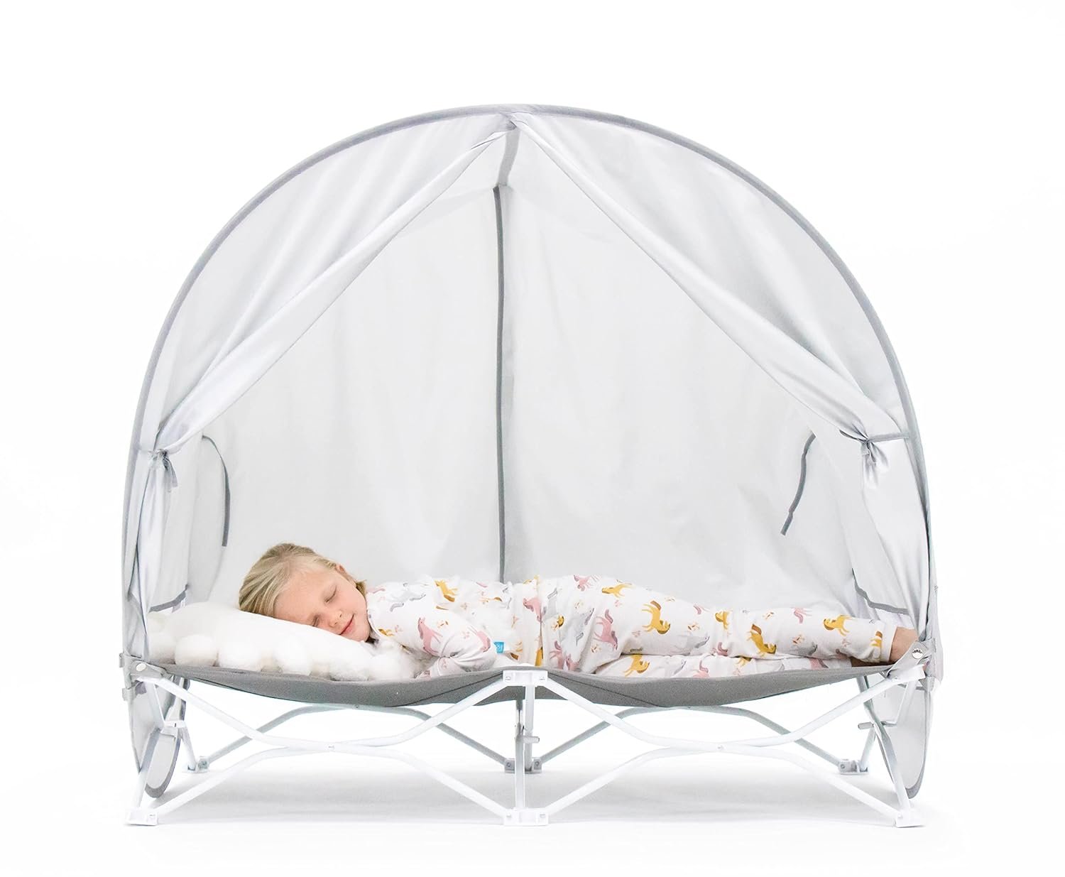 The Regalo My Cot® with Canopy Portable Toddler Bed™ is a multi-functional cot for your little one who needs a safe, comfortable place to rest or hang out. An essential item for travel, sleepovers, nap time, picnics, and camping, the My Cot® with canopy was designed for portability. Setting up in seconds, the My Cot® can hold children each up to 75 pounds and is ideal for children 2-5 years old. The UPF 50 canopy quickly pops open and snaps on to create a covered space to hang out. The compact canopy has two doors that can be shut or tied open.
