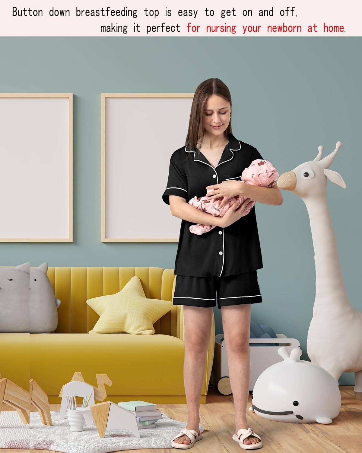 Our postpartum nursing pajamas set consist of 1 piece short sleeve top+1 piece shorts+ 1 piece long pants.