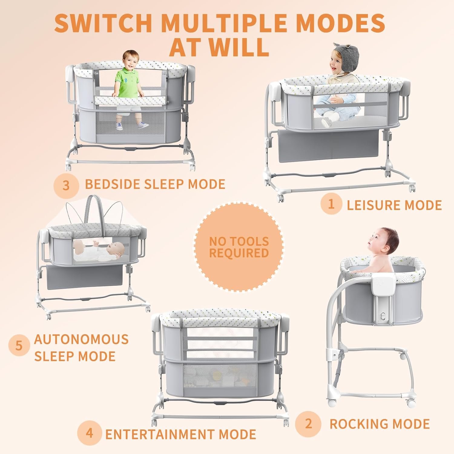 1.🌼🌼Multifunctional Baby Bassinets: 5 modes can be converted to each otherthey are rocking bassinet, single-layer bassinet, double-layer activity center, rocking mode, and coaxing sleep mode.Your baby deserves a comfortable place to sleep wherever you may go! So it meets all your needs!