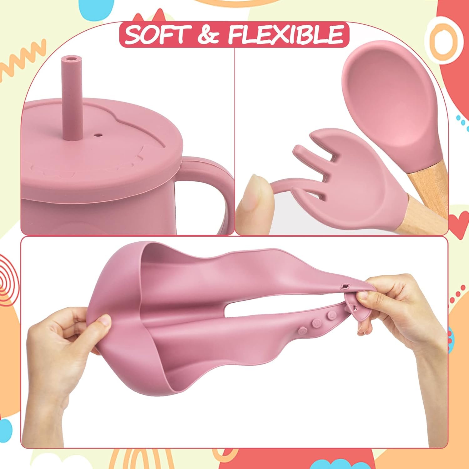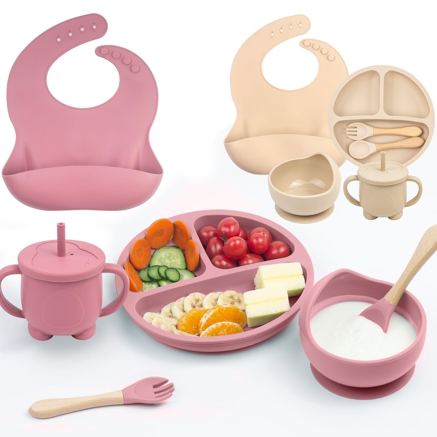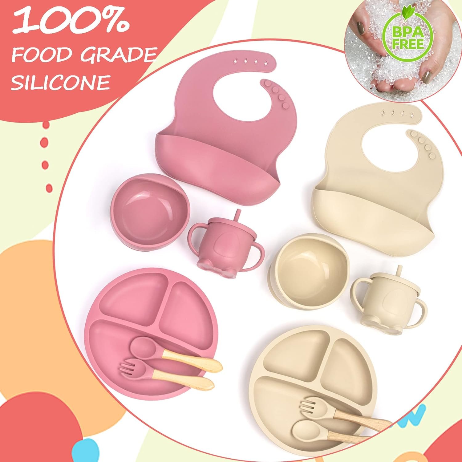 COMPLETE FEEDING SET: 2 Baby feeding supplies sets, each containing: 1 suction toddler plate, 1 suction baby bowl, 1 baby straw cup, 1 adjustable baby bib, 1 baby spoon and 1 baby fork.