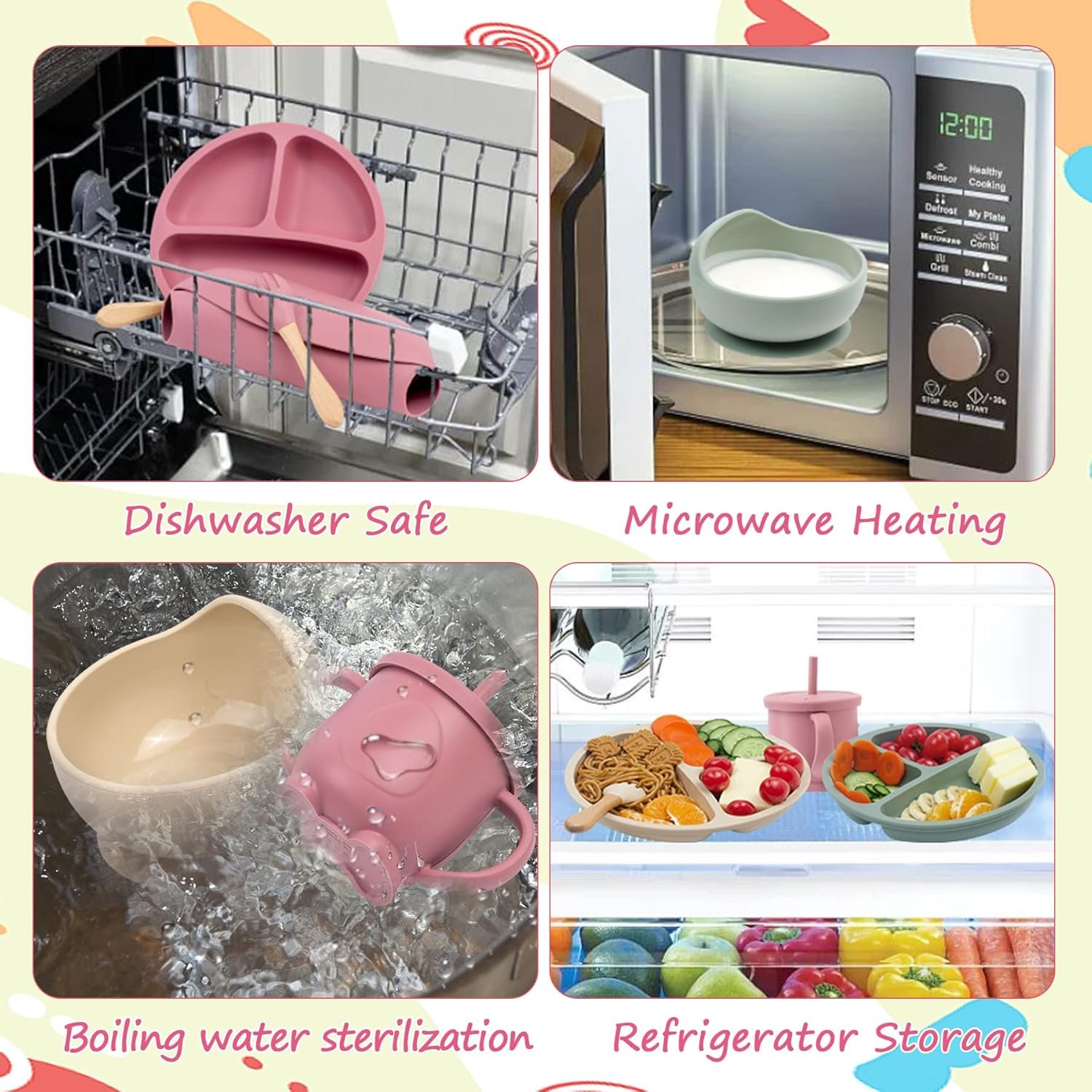 BABY TRAINING KIT: The toddler plate and bowl set has a strong suction base that keeps the plate and bowl safely attached to the smooth tabletop,preventing the toddler utensils moving and sliding off. No worrying about kids making a mess on the floor, perfect for your child to practice eating on their own!