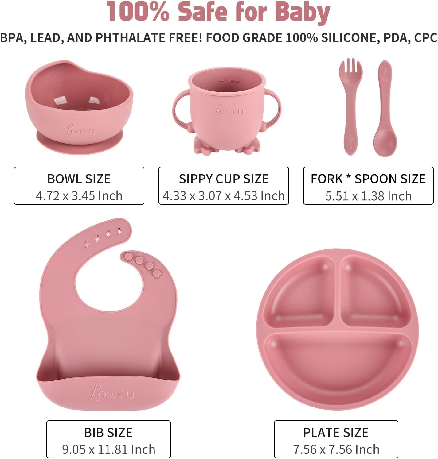 100% Food Grade Silicone: our BPA-free, Lead Free, Phthalates Free, kid-safe silicone baby plates, bowl, spoon and fork, sippy cup and bib contain zero fillers and will stick to any clean and smooth surface.