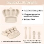 DIVIDED CROWN SHAPED SUCTION TODDLER PLATE – We adopted food grade silicone. This unique crown shaped plate featuring 5 divided sections with non-slip 6 suction points design will ensure the plate stays still during mealtime. This baby girl newborn essentials plates and bowls sets can withstand high heat making the kids plates baby feeding essentials toddler utensils baby necessities suitable for microwave use and can be cleaned in the dishwasher